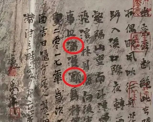 除此之外呢,在卢大师其他的书法作品当中,也大量发现了写错的常用字,经常会把一些常用字的偏旁部首替换混淆,如“金”旁写成“丝”旁,接下来的“愿”字,直接在简化字右边加了一个“页”,其实是“願”。等等。