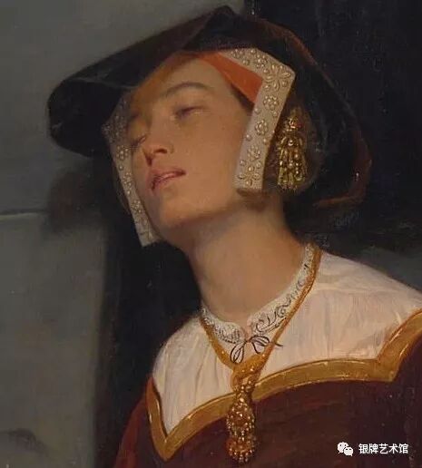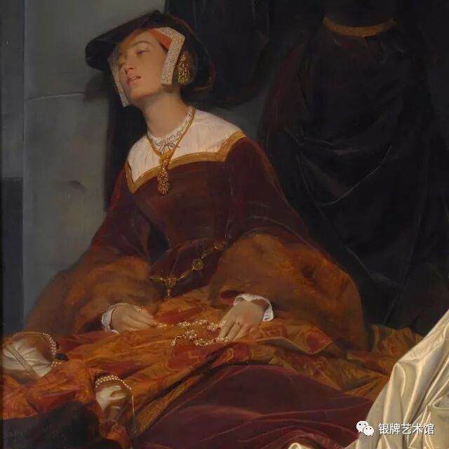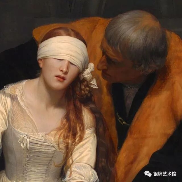 这幅画描绘亨利七世时期,年仅十七岁的珍妮·格瑞,在新教派爱德华六世去世后登基为英国女王,但仅在位不过九天,即遭到一帮天主教人士阴谋陷害而被处以死刑,这是1554年2月12日行刑前的最后一刻。