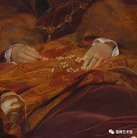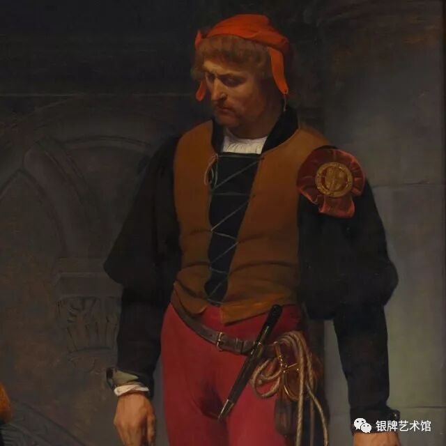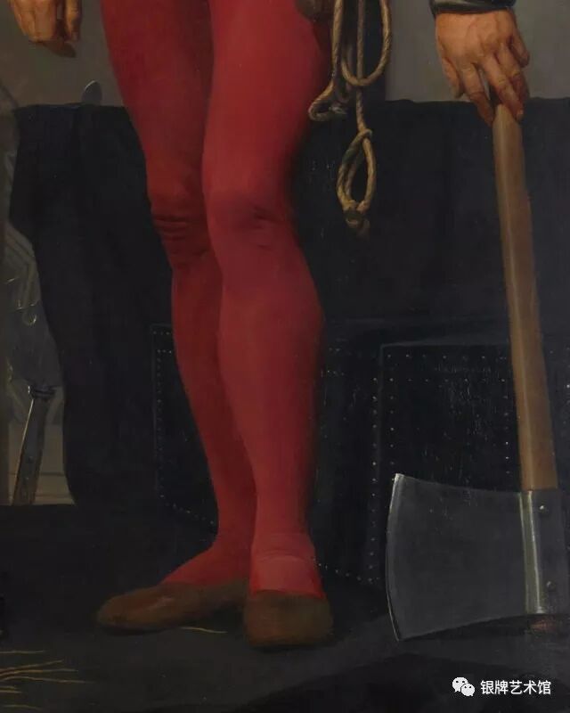 后方一位侍女偏过头去,仿佛不忍目睹这一惨状,画面右侧身穿黄褐色马甲的行刑者的表情也被刻画得十分细致,他似乎也在同情女主角的遭遇,有些不太符合当时的实际。