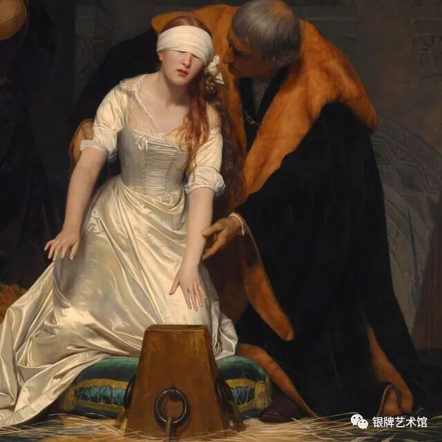大家好!今天给大家介绍法国画家德拉罗什创作于1833年的油画作品《珍妮·格瑞女士处决图》,现收藏于英国国家画廊。