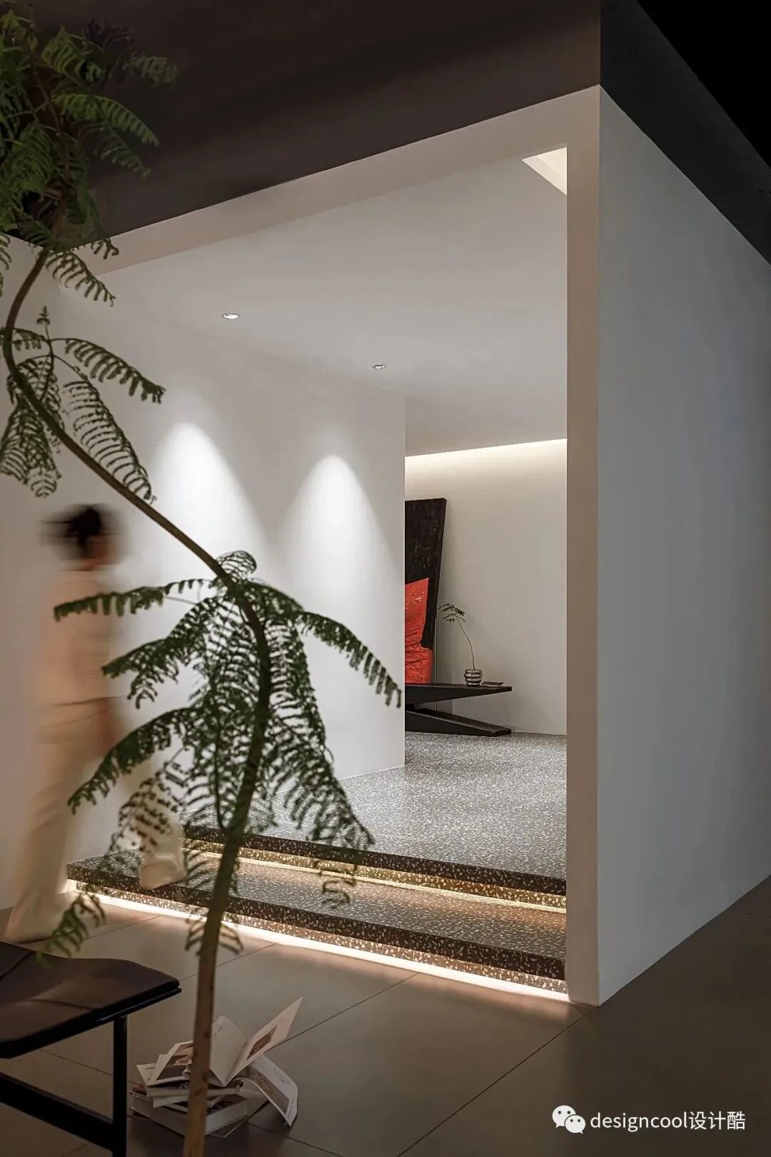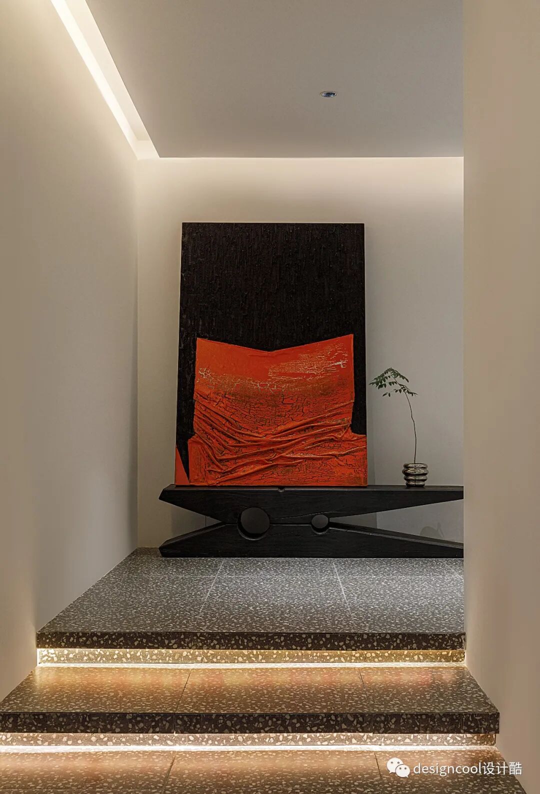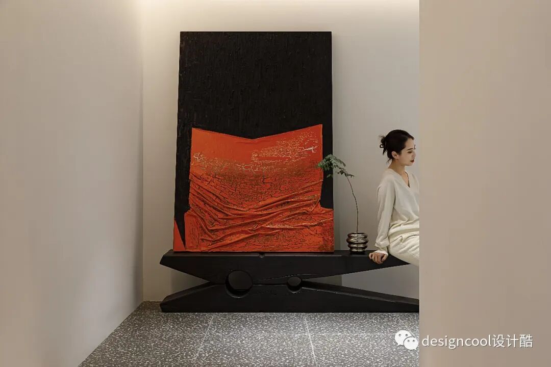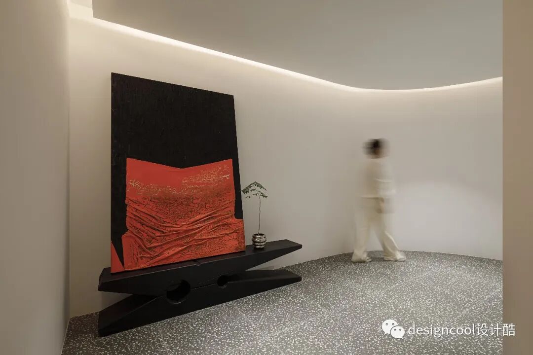 悬浮抬高的地台,隐形灯带在阶梯边缘烘托,步入式展厅充满递进般的仪式感。入口巨幅立体涂料画作映入眼帘,大面积色块,点缀极简空间。