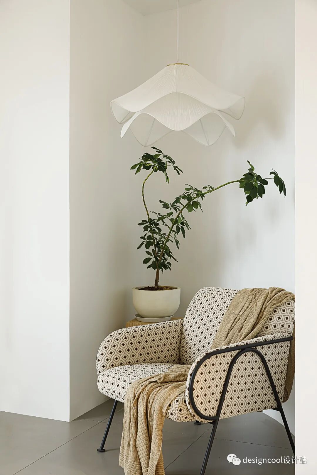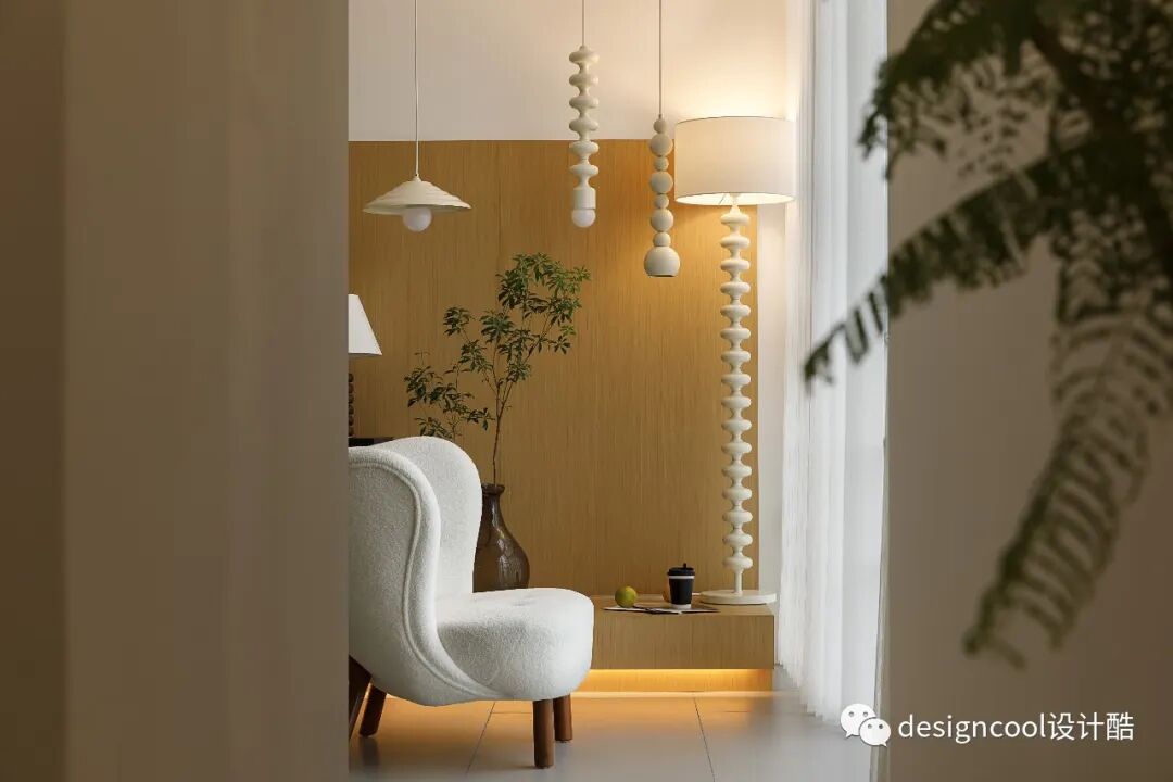柔美奶油色百褶花瓣灯饰,搭配一把惬意的中古单人沙发椅,像极江南雨天的恬静悠然。