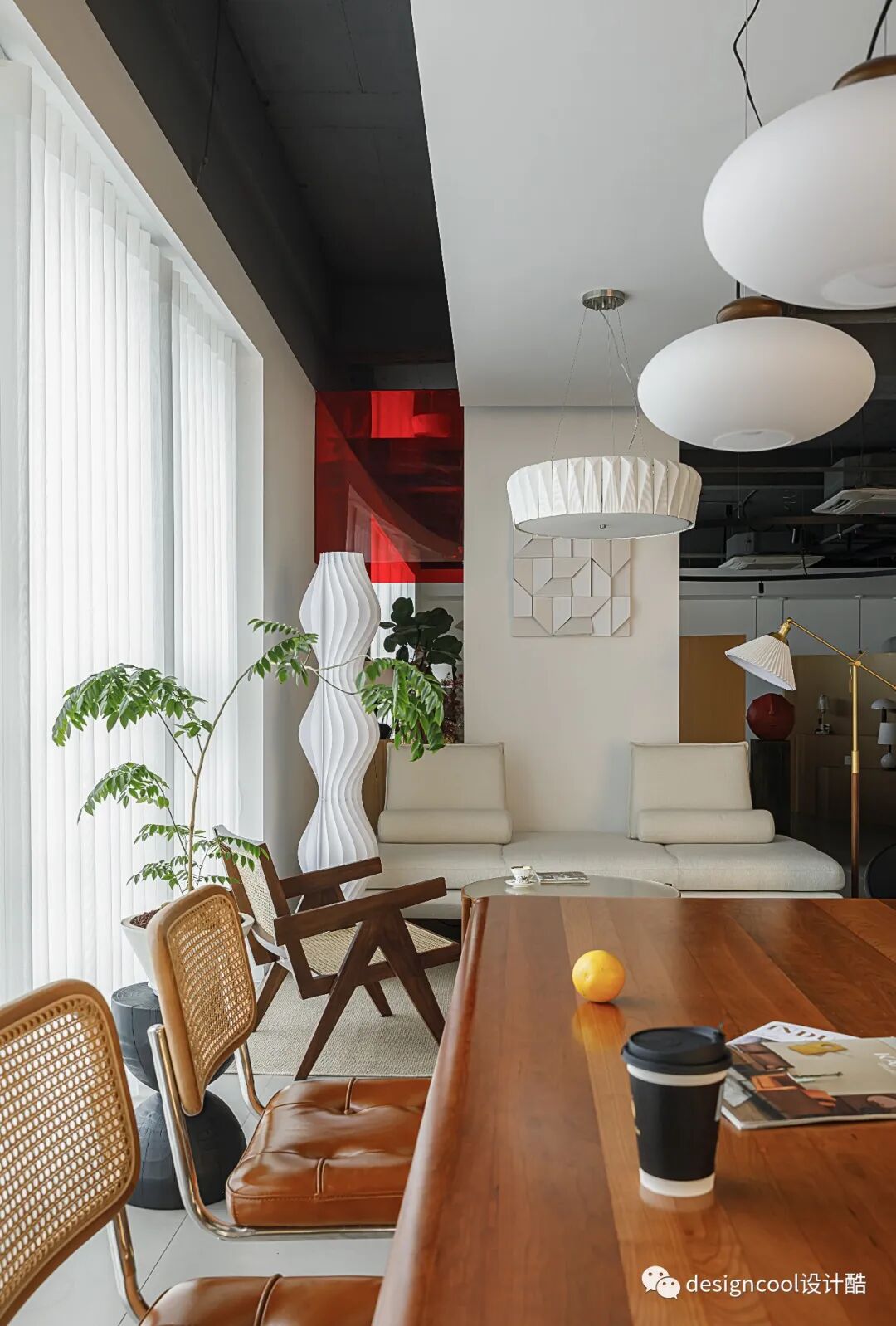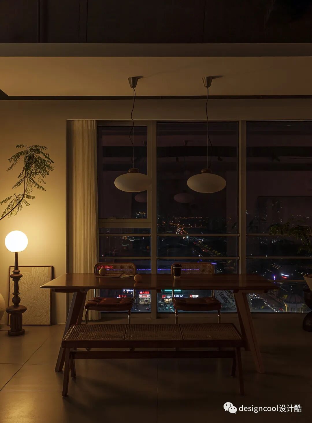 长条木桌,可茶歇、洽谈或小憩。也是用餐区吊灯的场景展示。