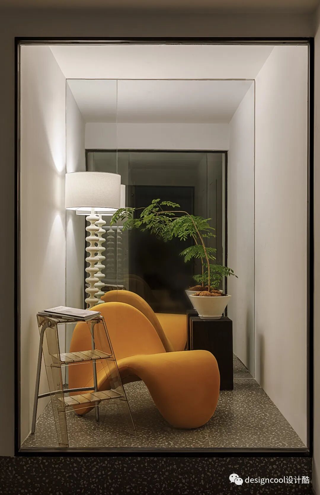 展厅外通道的展示橱窗。以沙发、灯饰、绿植,浓缩万家灯火里一角经典温馨的生活场景。