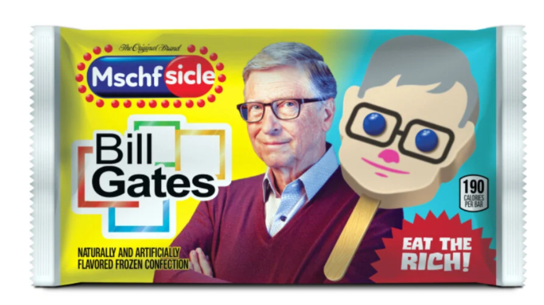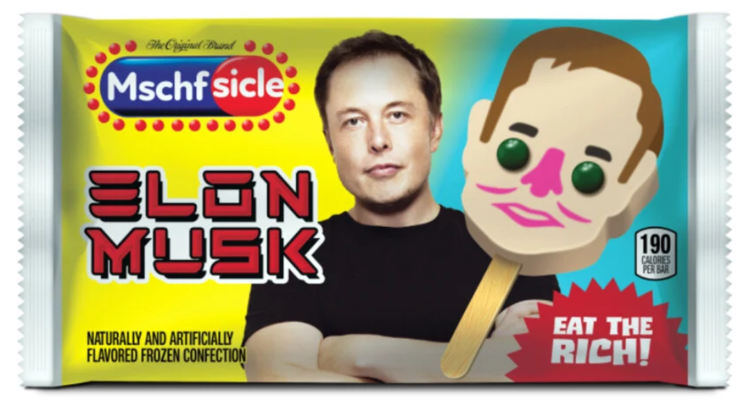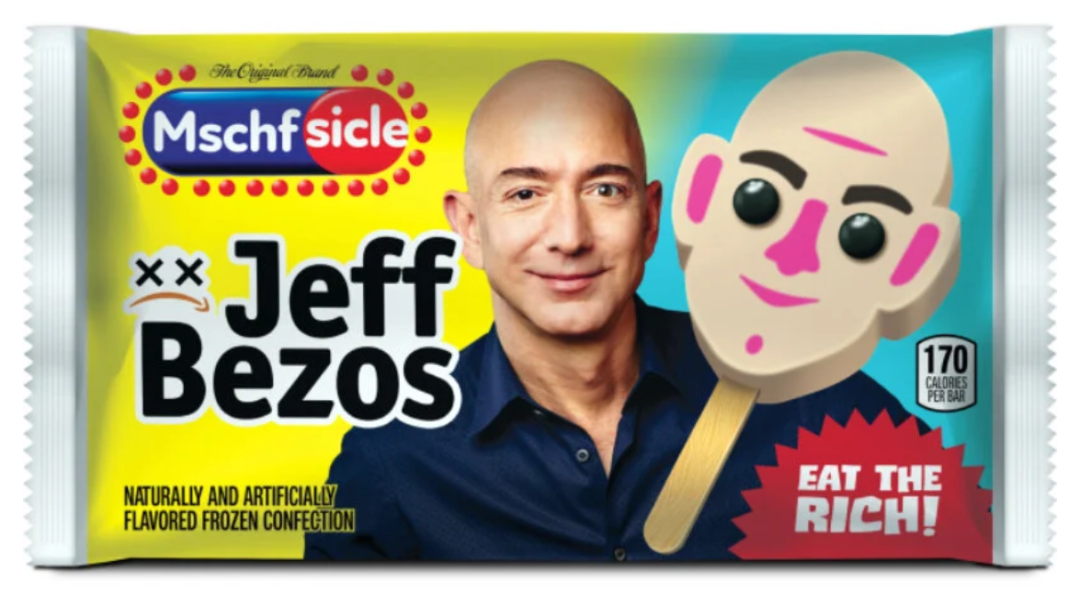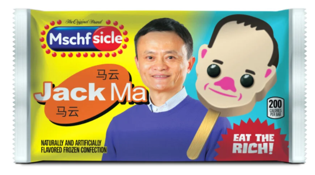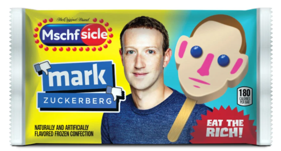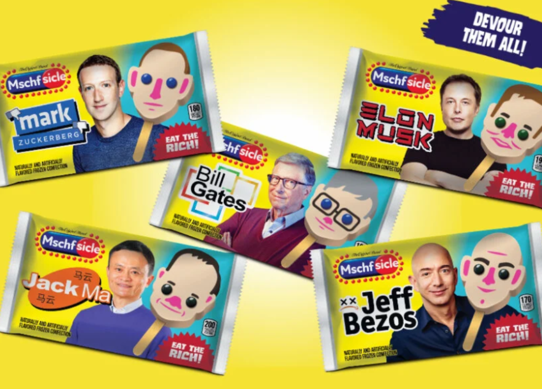 MSCHF设计了一款叫做“吃掉富人”的冰棒,(Eat the Rich popsicles),这是一套设计主体是世界上最富有的百万富翁的冰淇淋和食品艺术。仅从包装上看,这些顶级商人的图片就以他们公司品牌形象的印刷名称风格为封面增色不少:Facebook和Meta的马克·扎克伯格、微软的比尔·盖茨、特斯拉和SpaceX的埃隆·马斯克、亚马逊的杰夫·贝佐斯、和阿里巴巴的马云。