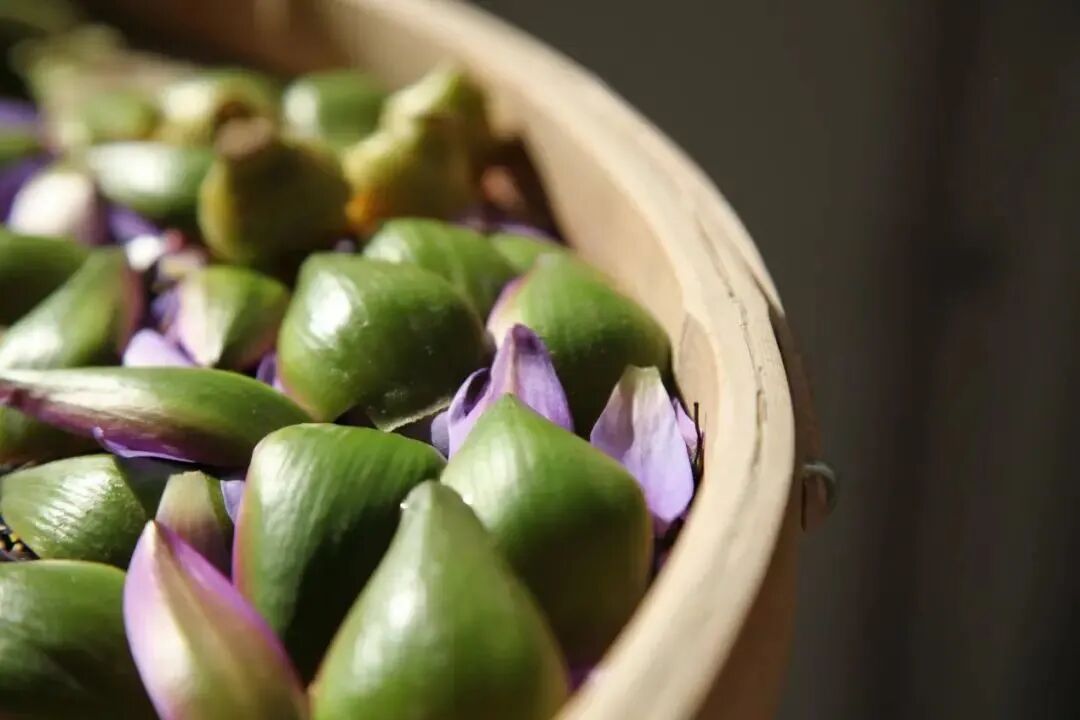 制作时,将龙井粗研放入新采的莲花中,并用绳子裹住,静置两天,