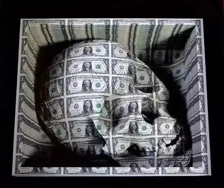 于是,他将1.1万张面值1美元的钞票(约7万人民币),摞成了60厘米高的正方体,借助洗纹身用的激光技术,将其雕刻成骷髅头的模样。