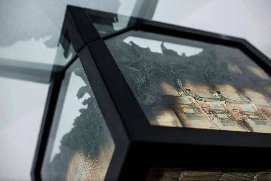 此艺术品远看是一张四面透明的玻璃桌,桌面有一簇火苗。凑近看,你会发现玻璃桌内装满了“纸币”,而火苗正在燃烧这些纸币,并且部分已经变成焦黑的灰烬。