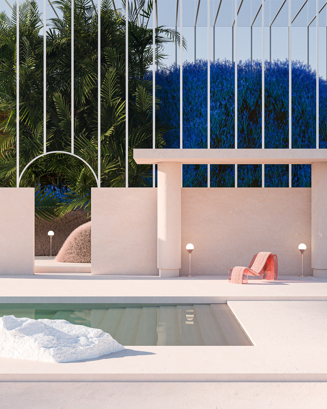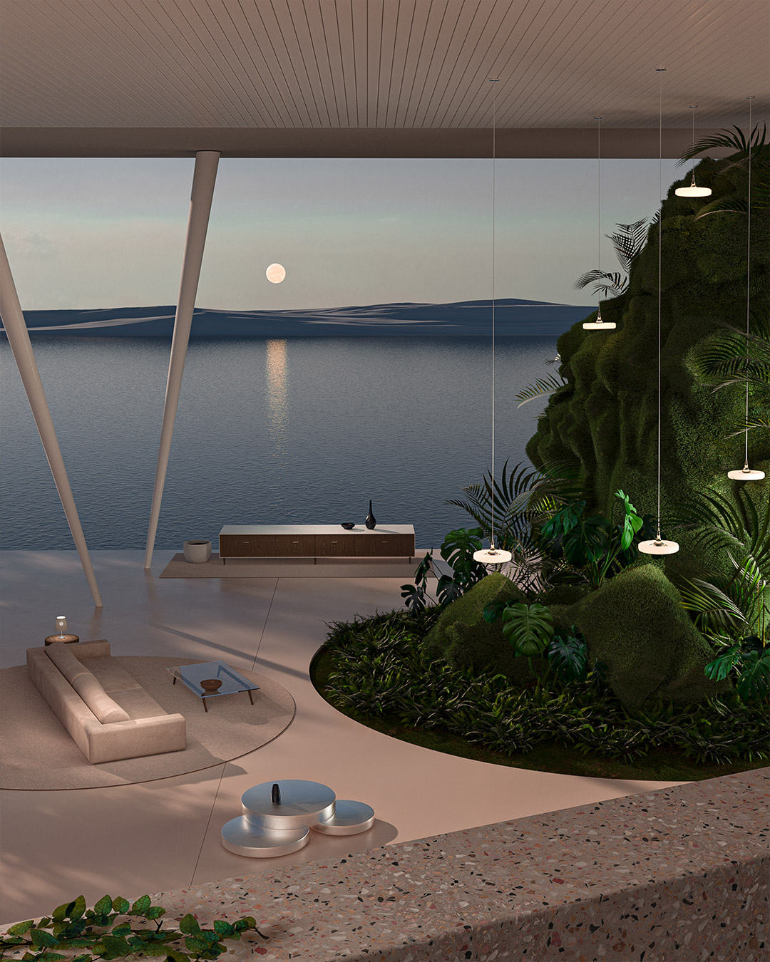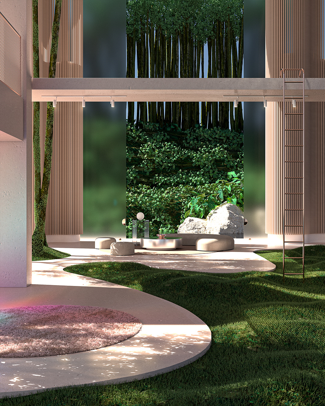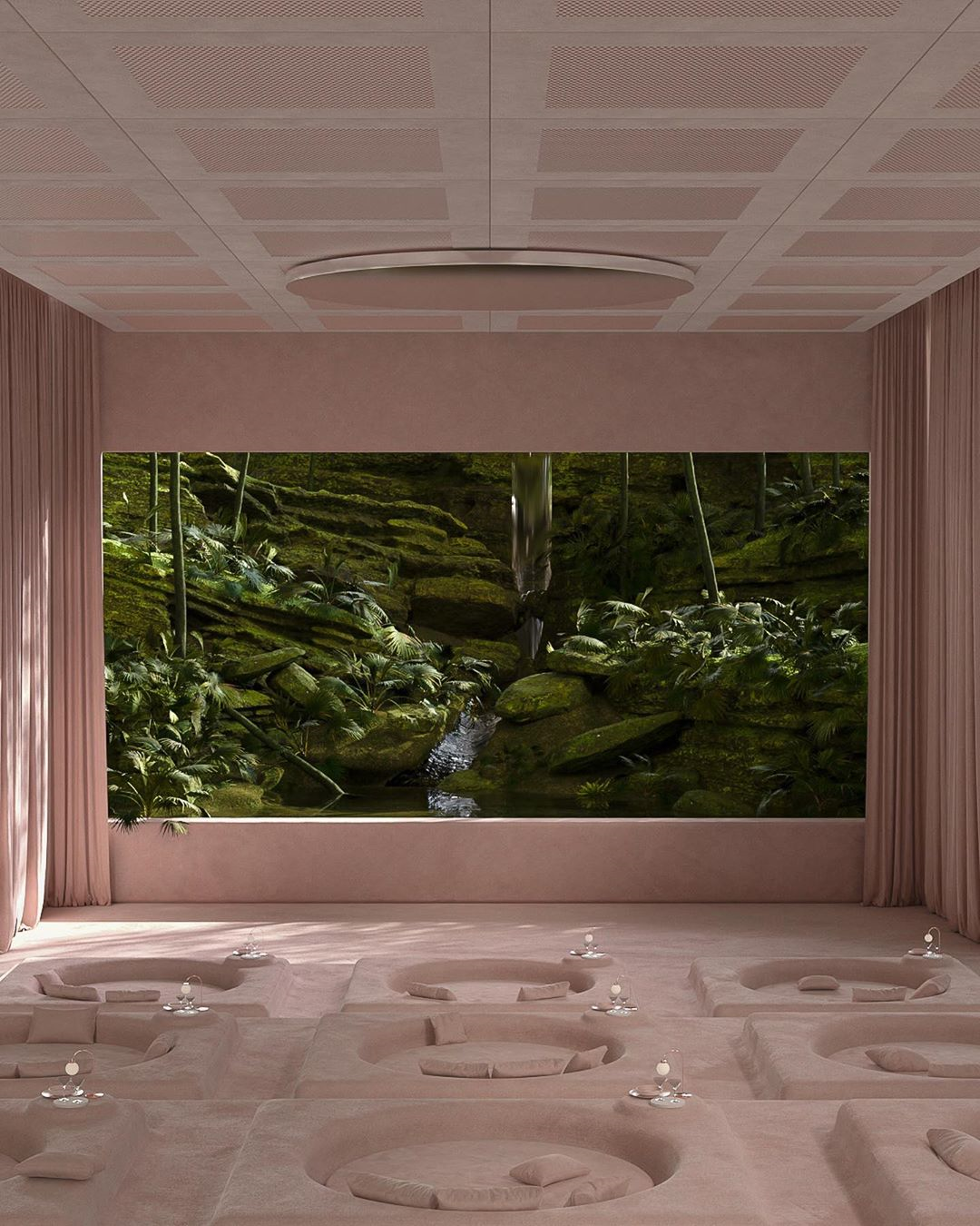 电影院的设计更是出乎意料,画面中可以感觉到 Paul Milinski 对于宁静的极简设计与杂草丛生的自然有着独特的审美偏好。