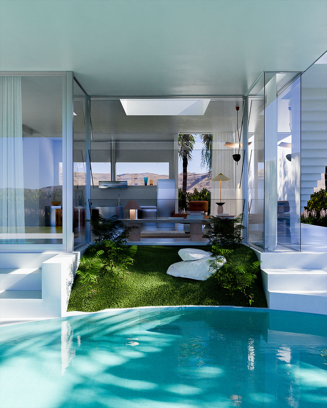 这是一个非常有趣的花园名为「Grass House No1」,设计师将建筑、沙发、茶几、草地、岩石结合,在静态的画面中,惬意地展现出专属这个区域的迷人姿态。