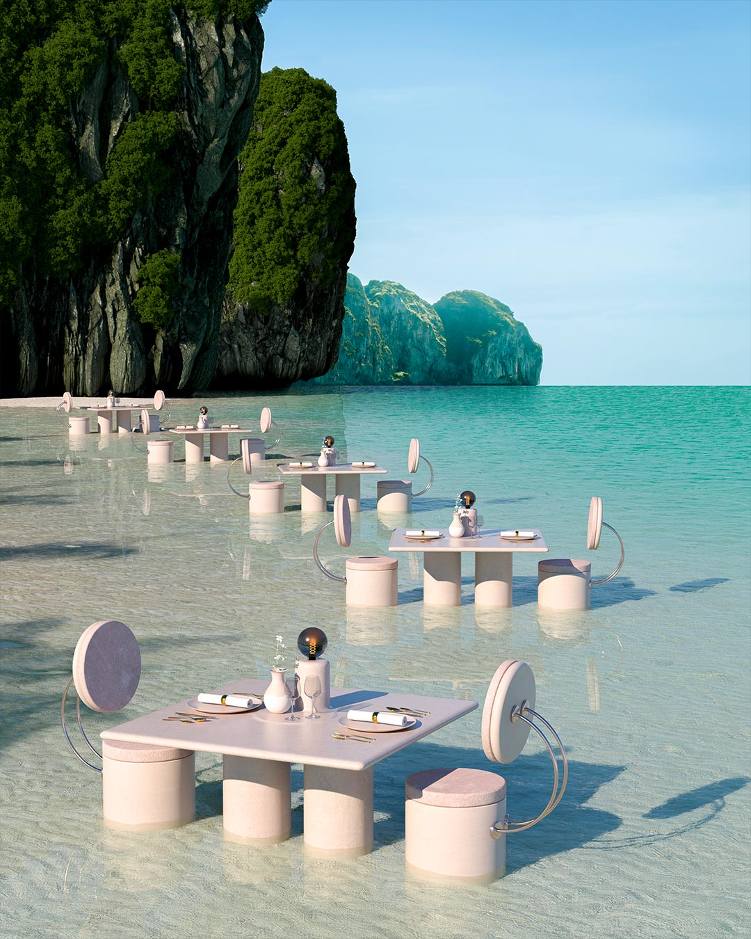 「Table for two」是一个水中餐厅,海天相接的平面一眼望去宁静通透,试想一下当你与伴侣在这样的环境中,一边享用着美食,一边感受水拍打着你的脚,吹着清凉的自然风,是种怎样的愉悦体验。