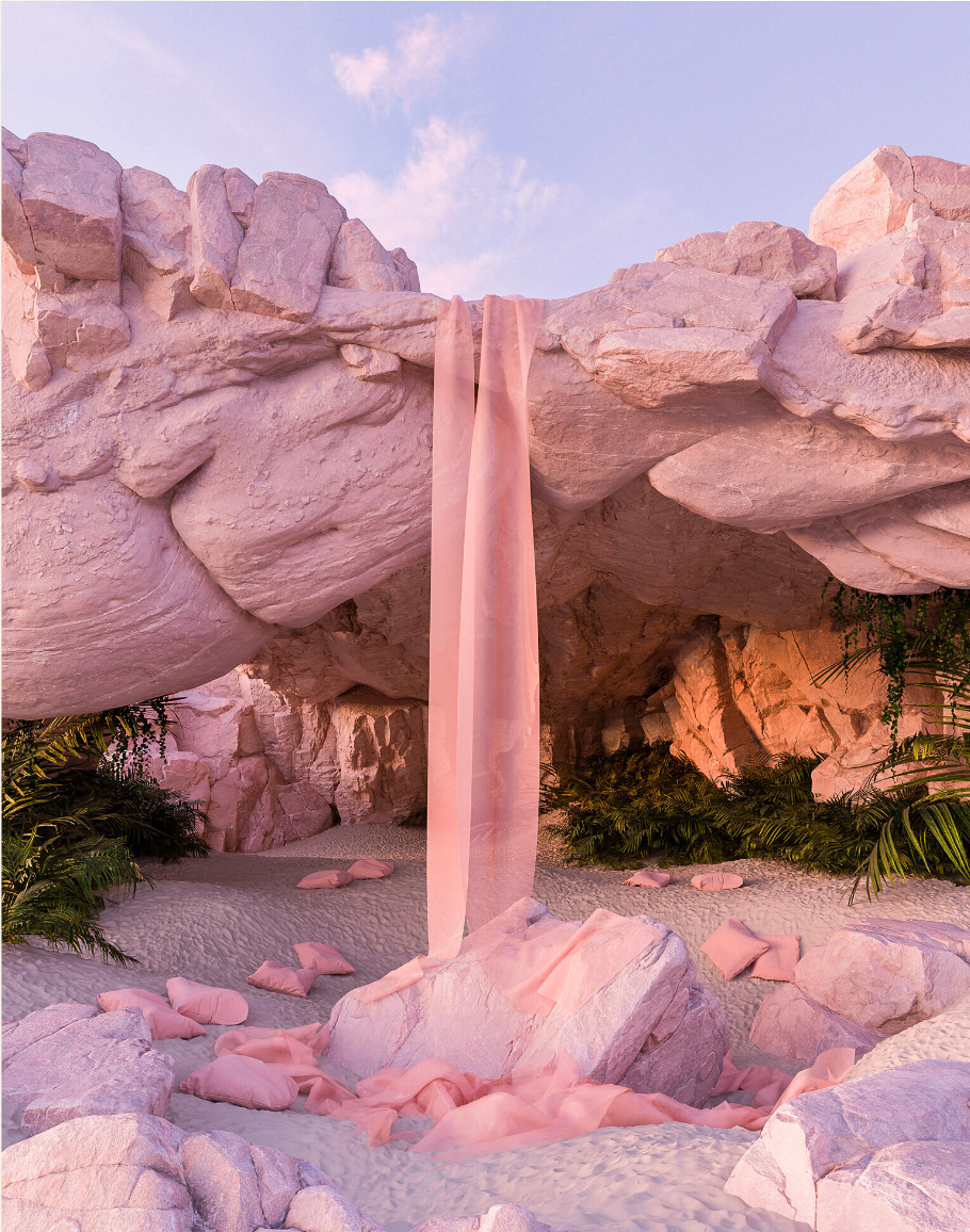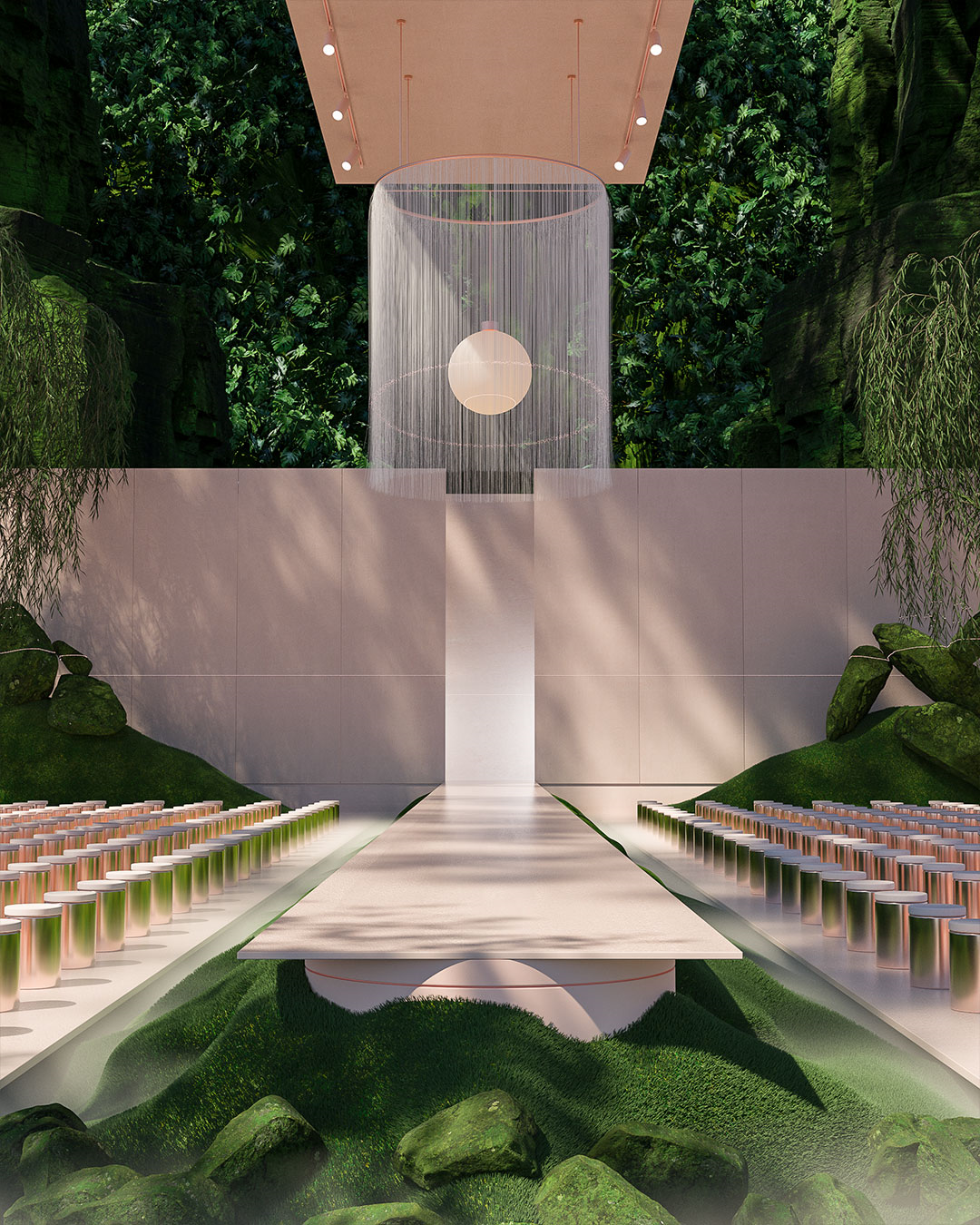 这个 T 台空间名为「Runway」,满足了顾客欣赏华丽走秀,看精彩表演的需求。整个区域同样融入了岩石和绿植作为背景,营造出超现实主义的环境氛围。