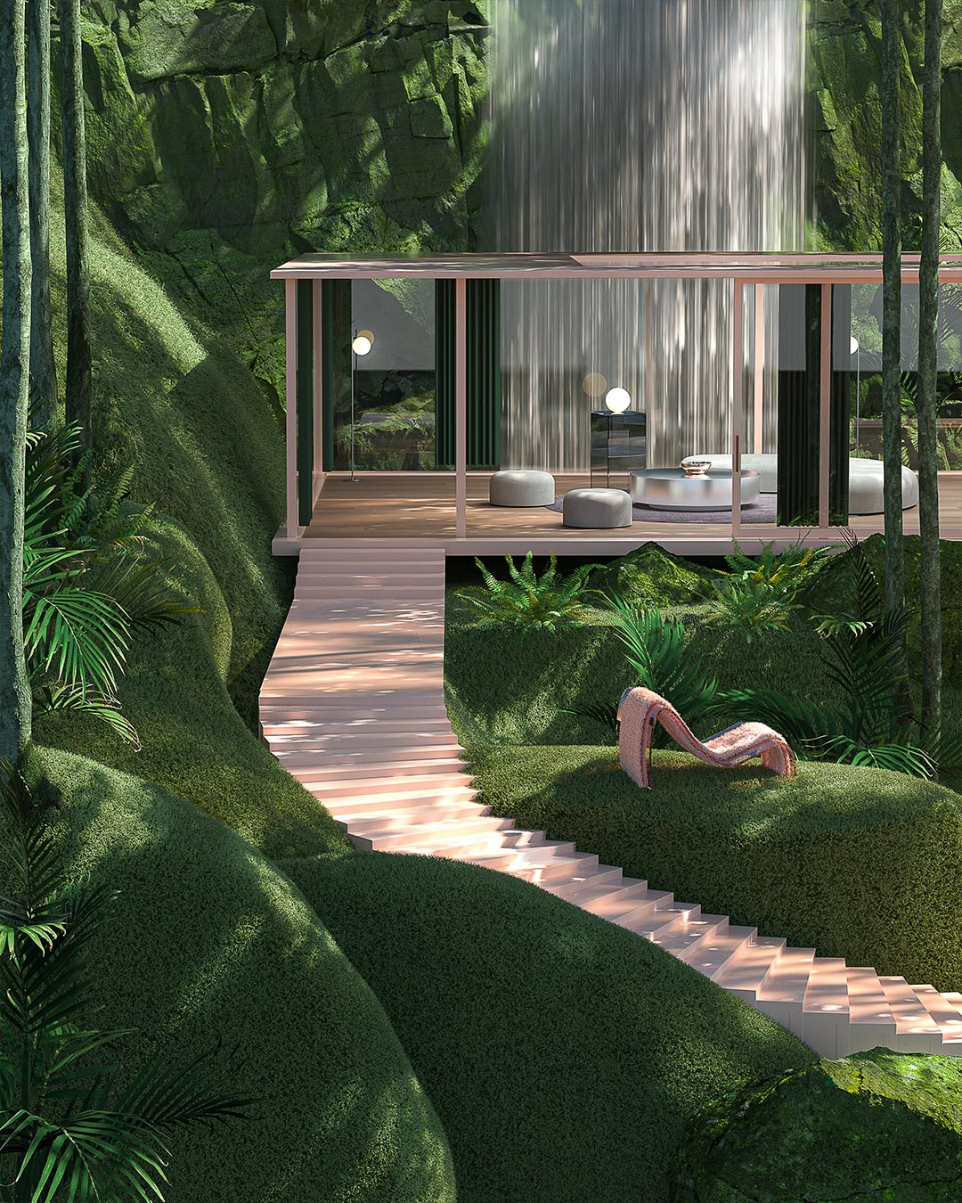 「Riverbed」坐落于山谷环绕的宁静湖畔边,激起水雾的瀑布与朝气蓬勃的绿植,像是天然的屏障,也为画面带来一丝禅意。