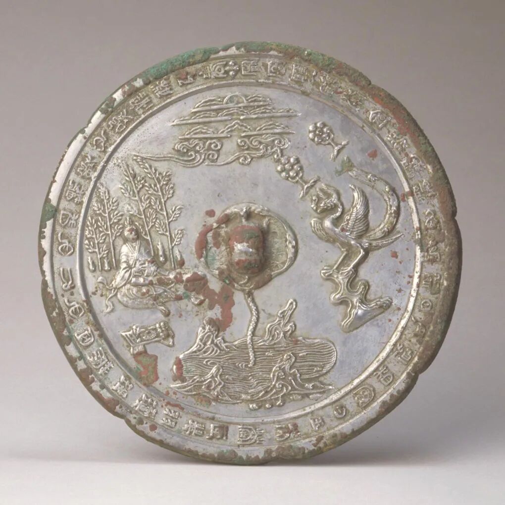 镜八出葵花形,圆钮。钮上方饰祥云托月纹,下方饰池水山石,自池中生出一枝莲叶,即为钮座。左侧一人峨冠博带,坐而抚琴,前设香案,后依竹林。右侧一凤,栖于石上,凤上方饰6瓣花两枝。