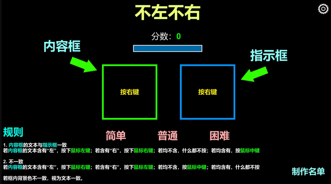 例如《不左不右》可能是这些作品中玩法最简单的游戏,玩家只需要按照要求点击鼠标左键或者右键即可,但作者在游戏规则上玩了点「文字游戏」——玩家必须反复思考左右两框中的文字变化、对应关系甚至颜色变化,并以此来协调手部动作完成点击,现场不少试玩的同学都表示「很难上手」、「点了几次就懵了」。