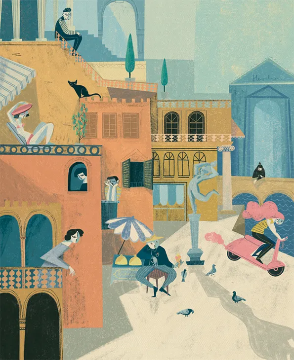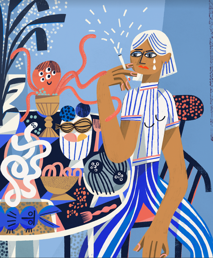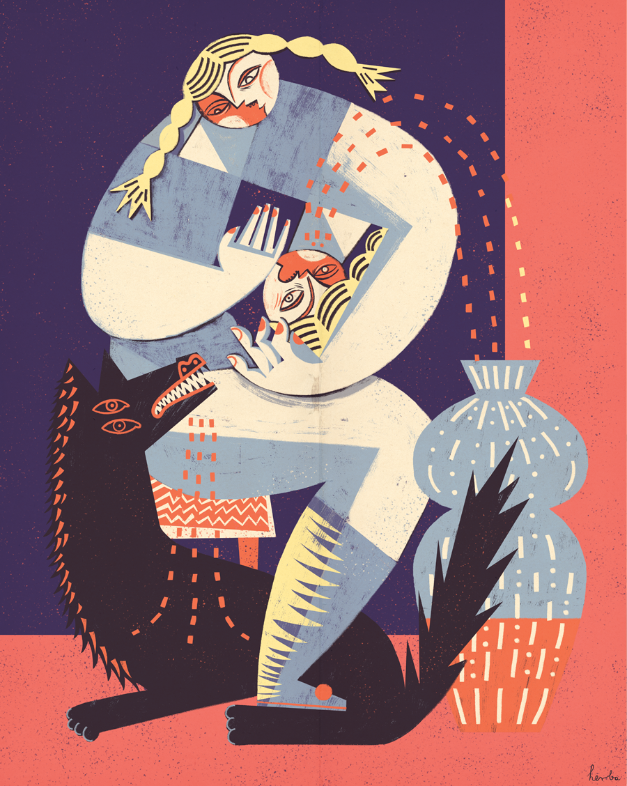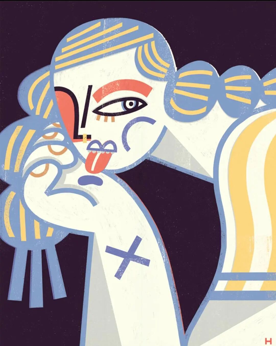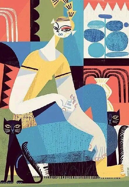 Gosia Herba深受毕加索立体主义的影响,笔下的插画和角色设计抽象大胆,用色对比夸张鲜明,充满绚丽的质感和比例匀称的人物,小而棱角的头和超大的四肢,风格独特而充满活力。