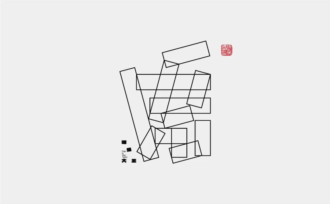 以图形堆叠的形式采用等宽直角的笔画部件按照文字的书写规律和基本结构,融合一定的物理原理使笔画部件形成堆叠、悬挂的感觉,营造一种物品的自由摆放感,与此同时在交集处进行角与线的对齐,无形中使堆叠产生一定的规律贴合笔画的书写走势,使形态产生一种具有开放的表达,不仅可以让文字在保证识别的前提下拥有抽象的几何表现,还能使文字具有一定的力量感。