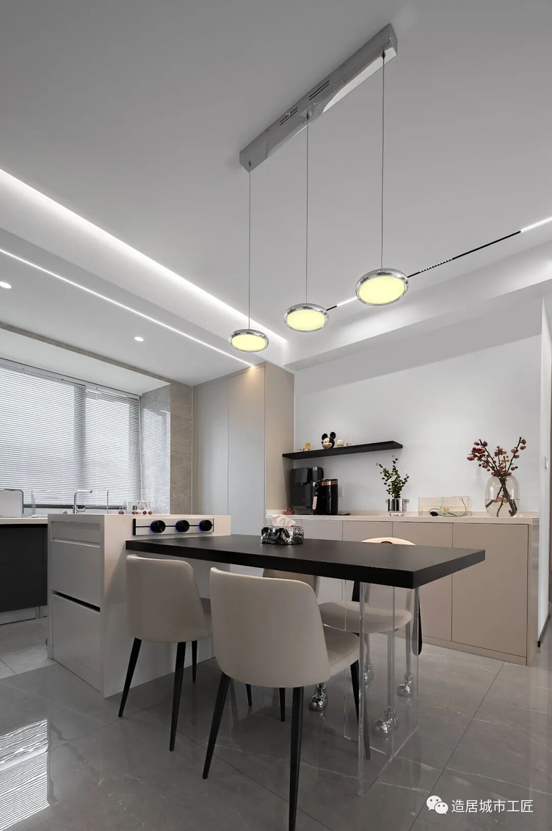 与其一体的餐厅选择了亚克力桌脚制造出悬浮岛台,一方面增加厨房料理台使用区域,一方面可以弱化柜体存在感,让整个空间更为宽阔明亮。顶部集成吊顶全部做了拆除,改成石膏板吊顶,刷白处理,与客厅连成一体,来达到延伸空间的作用。