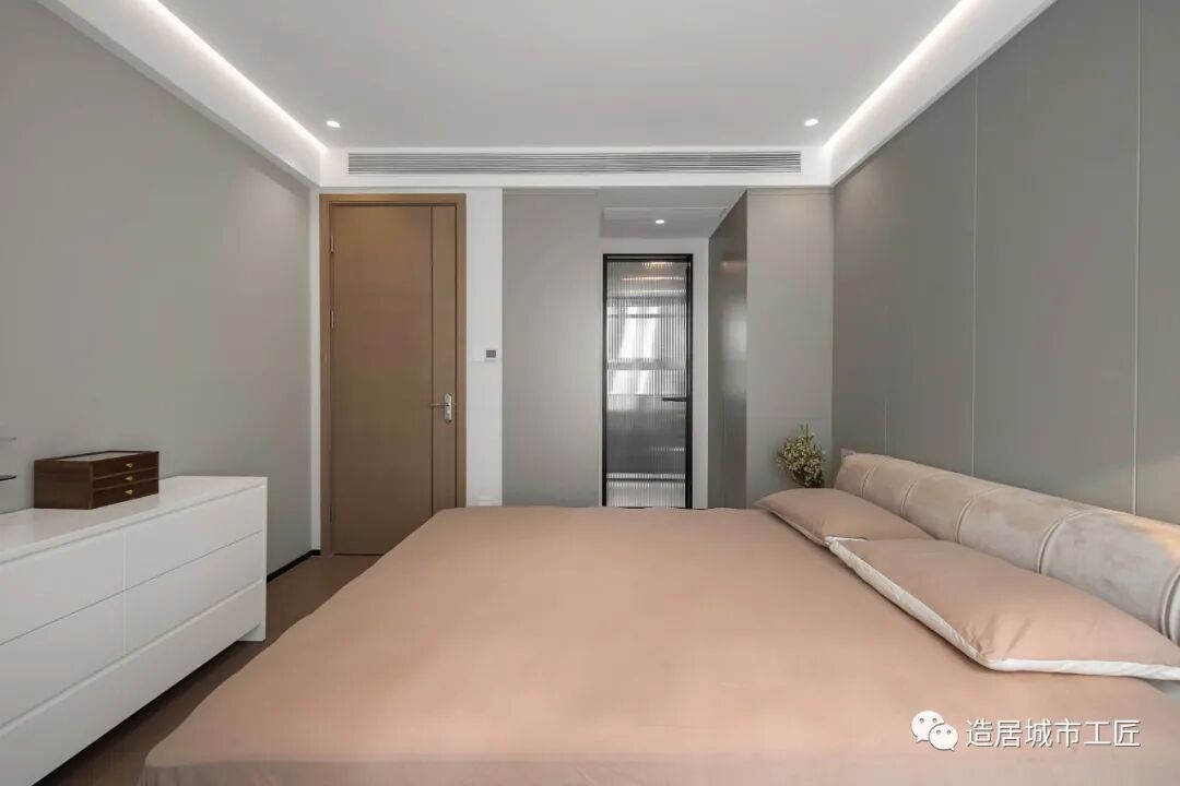 主卧做了相对多的拆改,先是拆除了原有的床头背景墙和边吊,重做30㎜硬包床头背景墙,拆除了原先配好的步入式衣帽间柜门,同时改掉主卫的开门方向,优化衣帽间的采光效果。