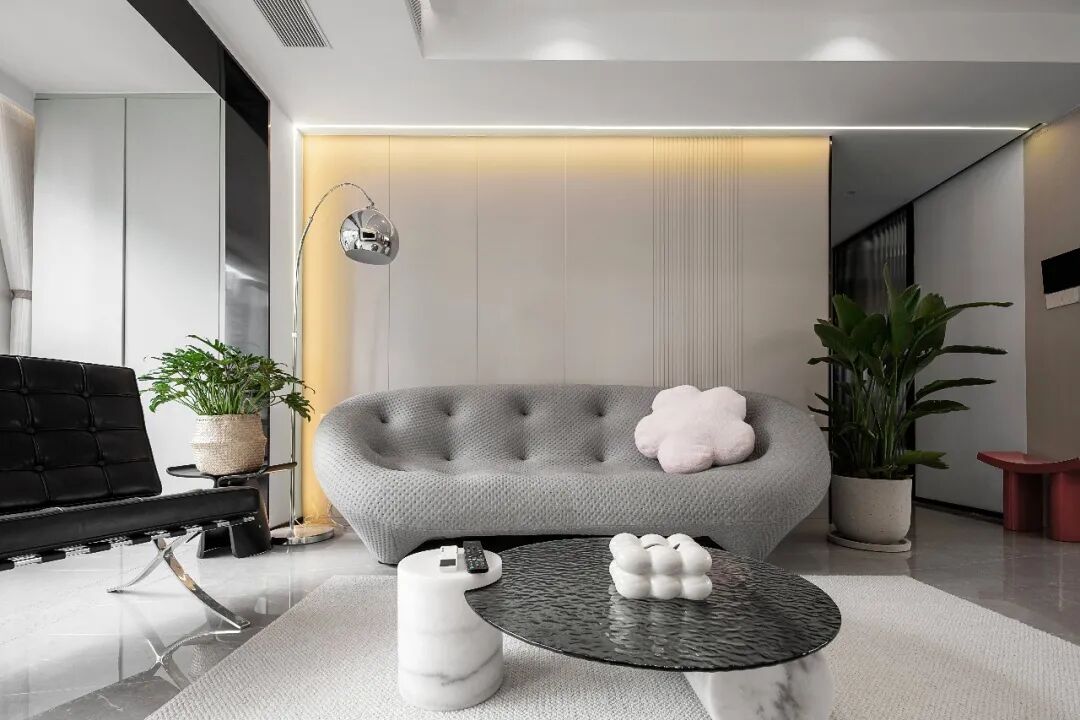 原有的电视背景墙被拆除,重新定制了一款与整体风格契合的电视柜,黑白两色附着在几何块面上,营造出一种干净利落的简约感。