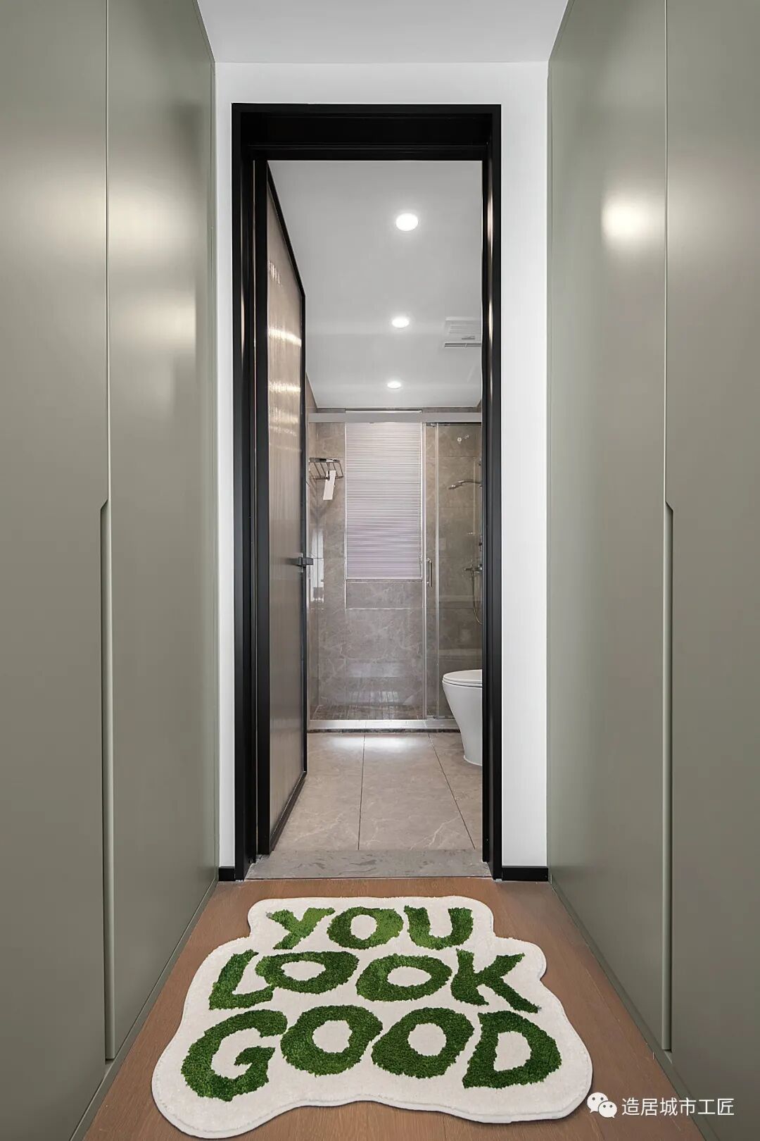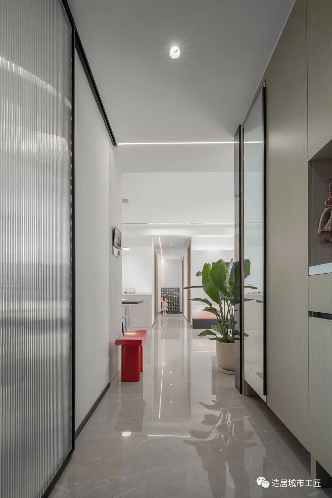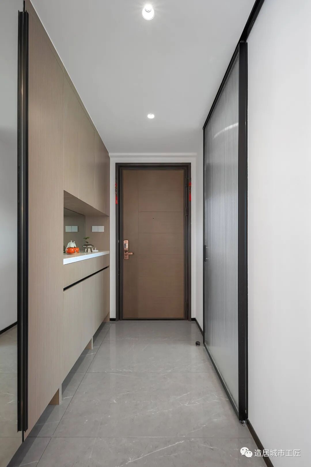 入户到客厅有一段较长的缓冲空间,以一排玄关柜展开,将功能性发挥到最大。顶部配以简单的筒灯,以一种近乎简洁的方式为这个区域提供日常照明。