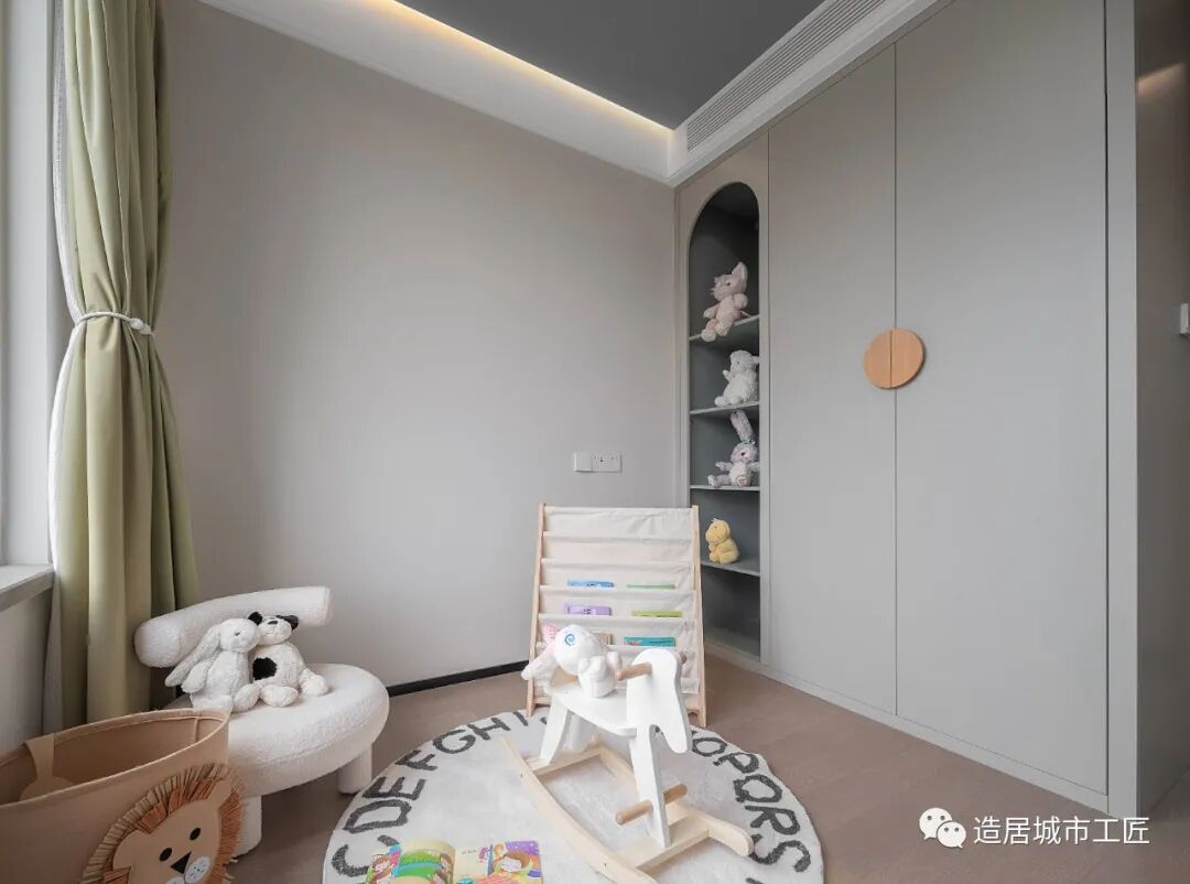 儿童房是预先准备的,暂时没有买床具,就先做玩耍间装扮。小沙发、木马、地毯、玩偶......童趣十足。