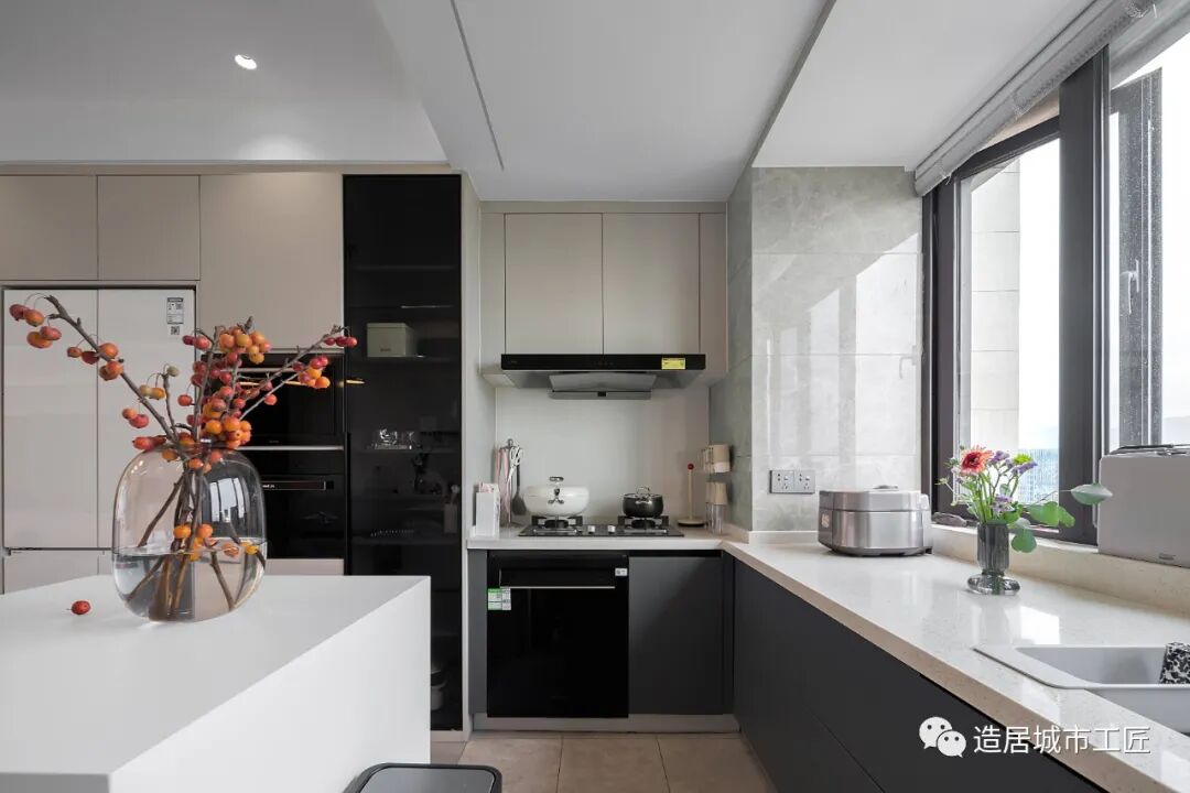 岛型的餐厨设计,与客厅走廊一道形成流畅的洄游动线,不论是在哪一个空间,家人们都可以彼此照看,互动与陪伴,治愈感十足。厨房尽头,白色的百叶窗光影斑驳,衬得这里的空间极其具有高级质感。