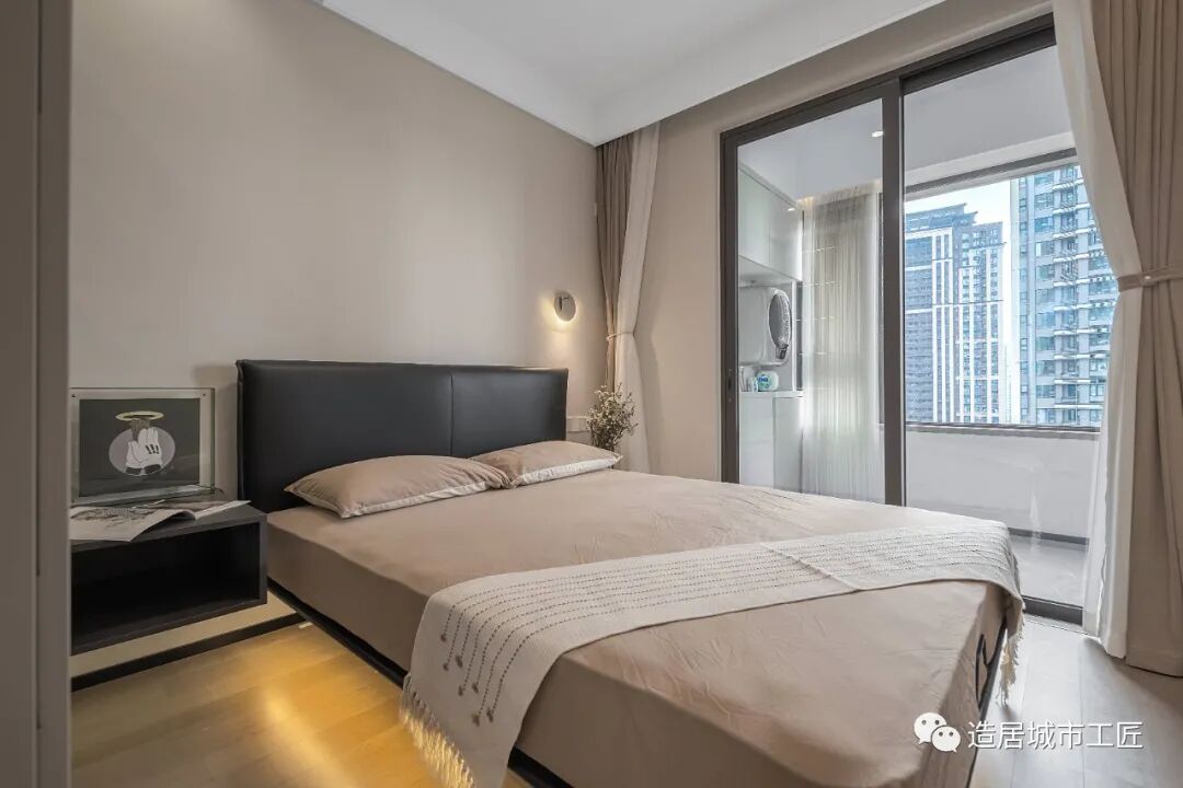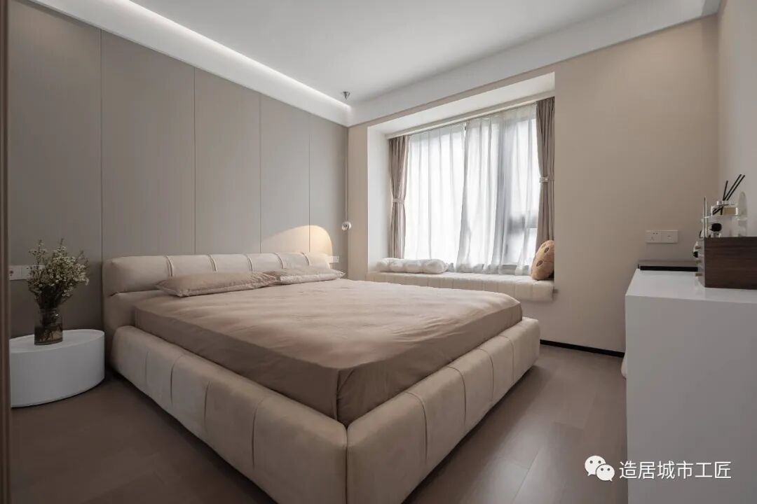 调整之后,用了杏子灰与原有白墙做拼色处理,深深浅浅,明暗有度,搭配卡其色床品,为整个卧室空间营造出一种舒适温馨的氛围感。