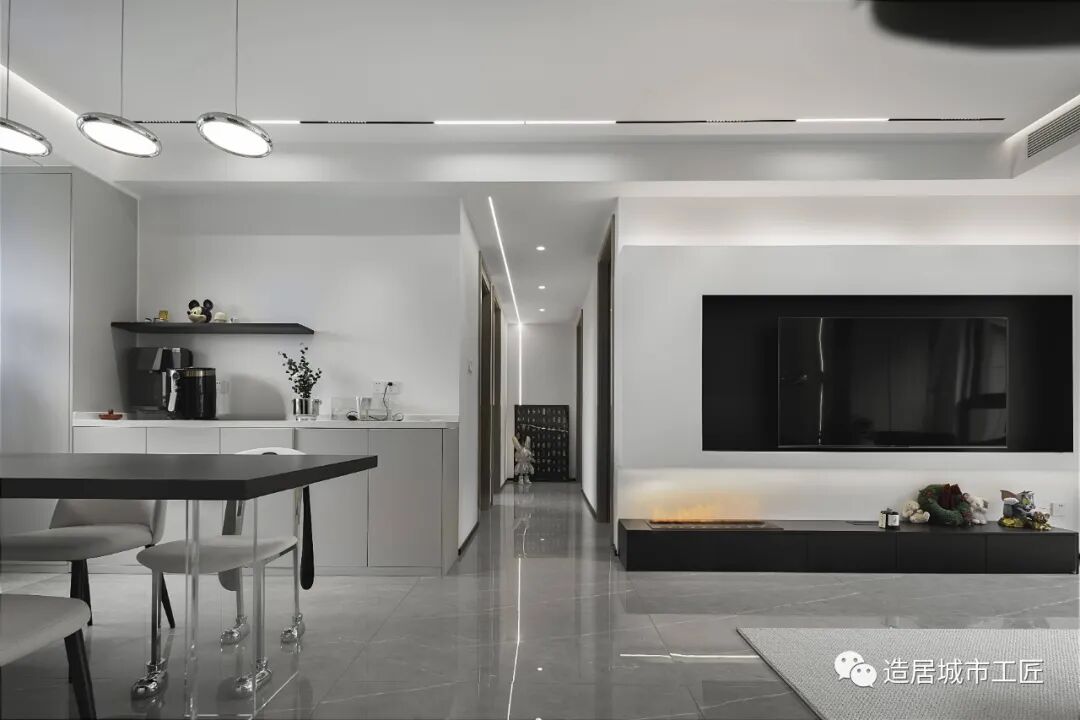嵌入式电视机与墙柜融为一体,让空间秩序保持一致,凸显几何线条的别致优雅。底部加装的雾化壁炉更是为这里增添了一丝暖意与温馨。