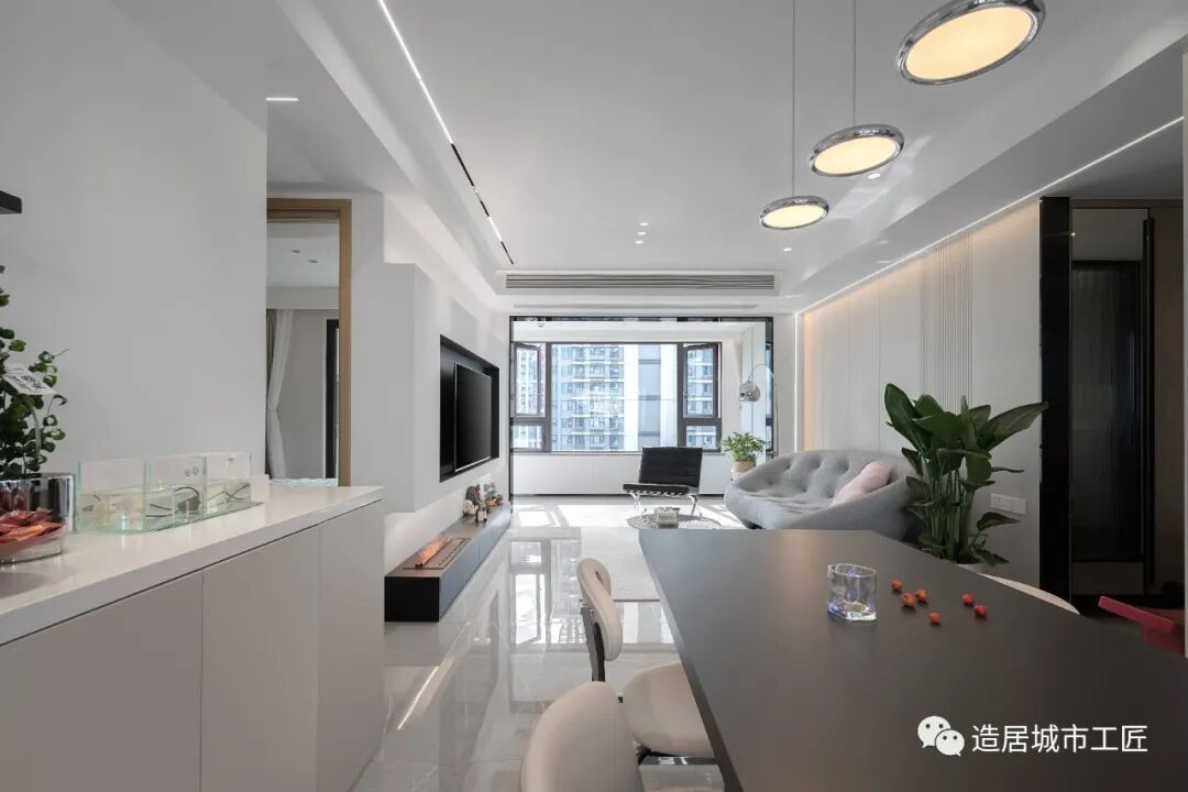 本案为精装房,原始结构对于屋主的居住需求有诸多限制,依照他们提出的需求对整体结构进行重塑后,以开放手法为表现语境,消除传统餐厨与客厅之间的隔阂,加入线性、几何元素,来完成场域空间的完整勾勒。