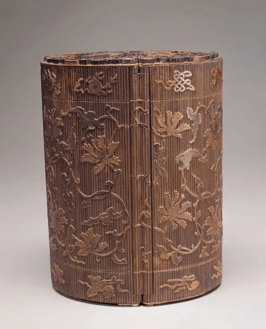 这件圆盒外壁用竹丝拼接后再黏饰缠枝番莲纹竹黄片,并且利用机轴原理,将圆筒形盒分成四个扇形,180°打开来可成为一字形小屏风,360°翻转后可成为一个正方形筒状。
