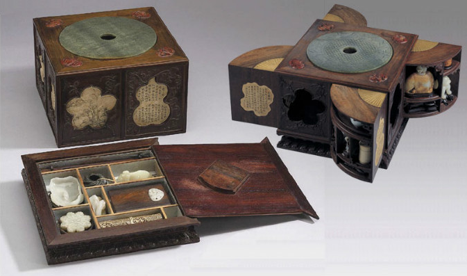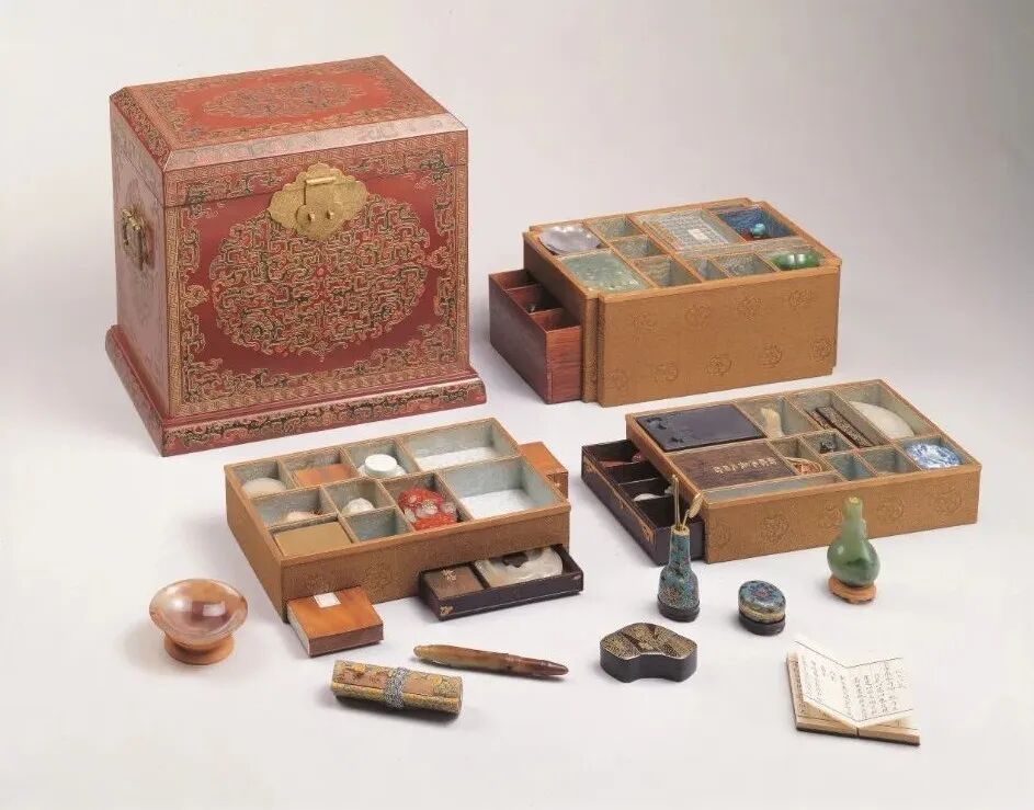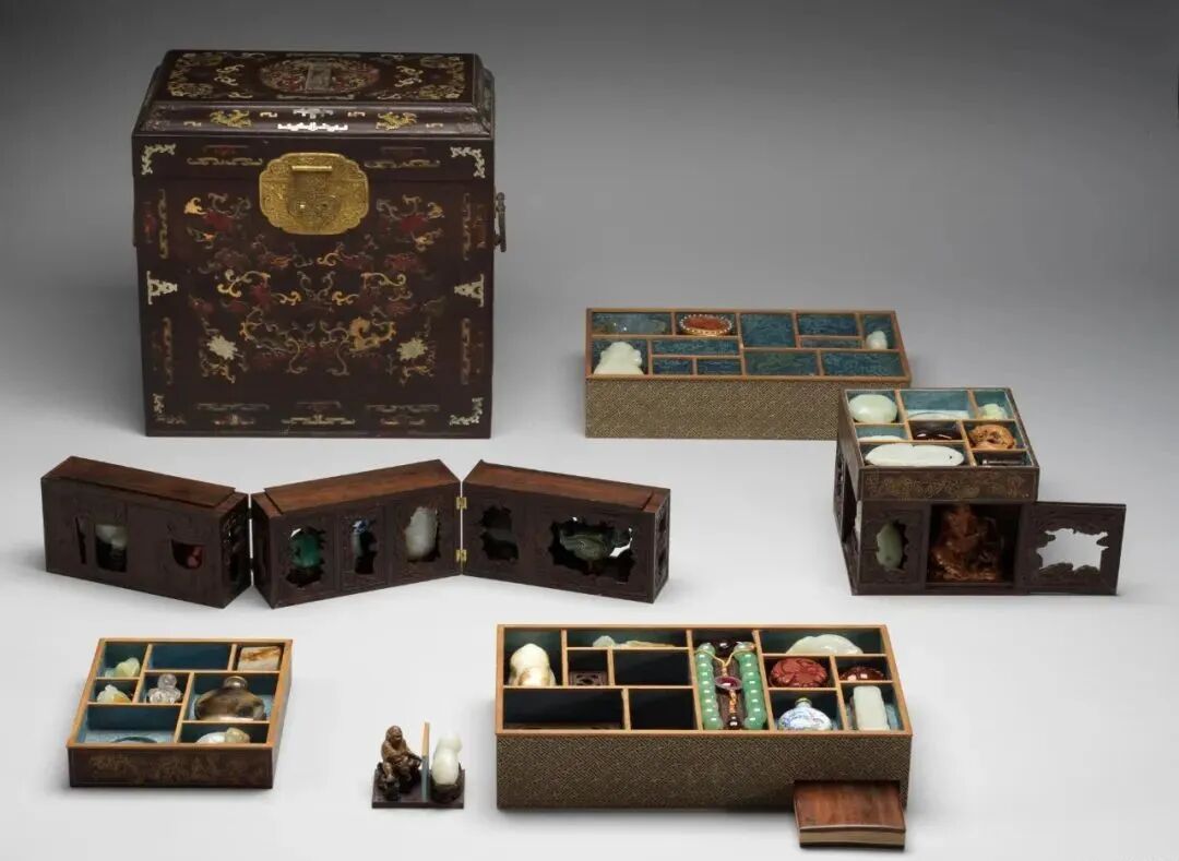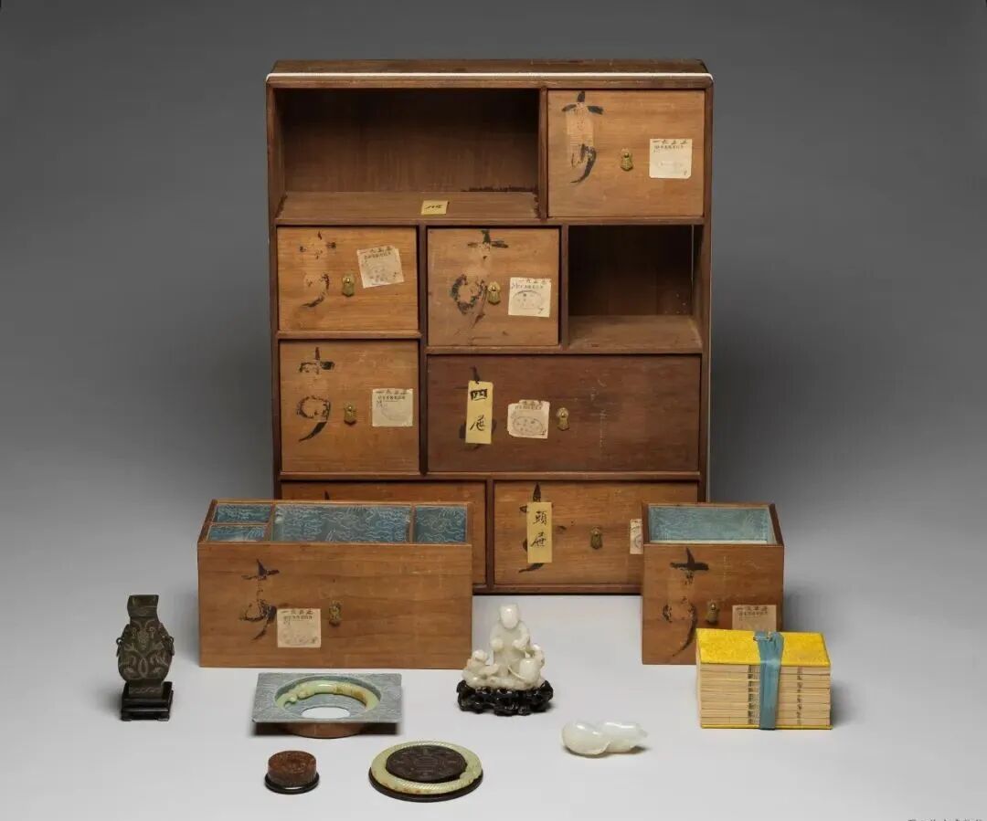 清乾隆 九屉木匣,匣内有60组件文物,每屉都以木胎做内屉,根据屉内空间再隔出不同屉。台北“故宫博物院”藏
