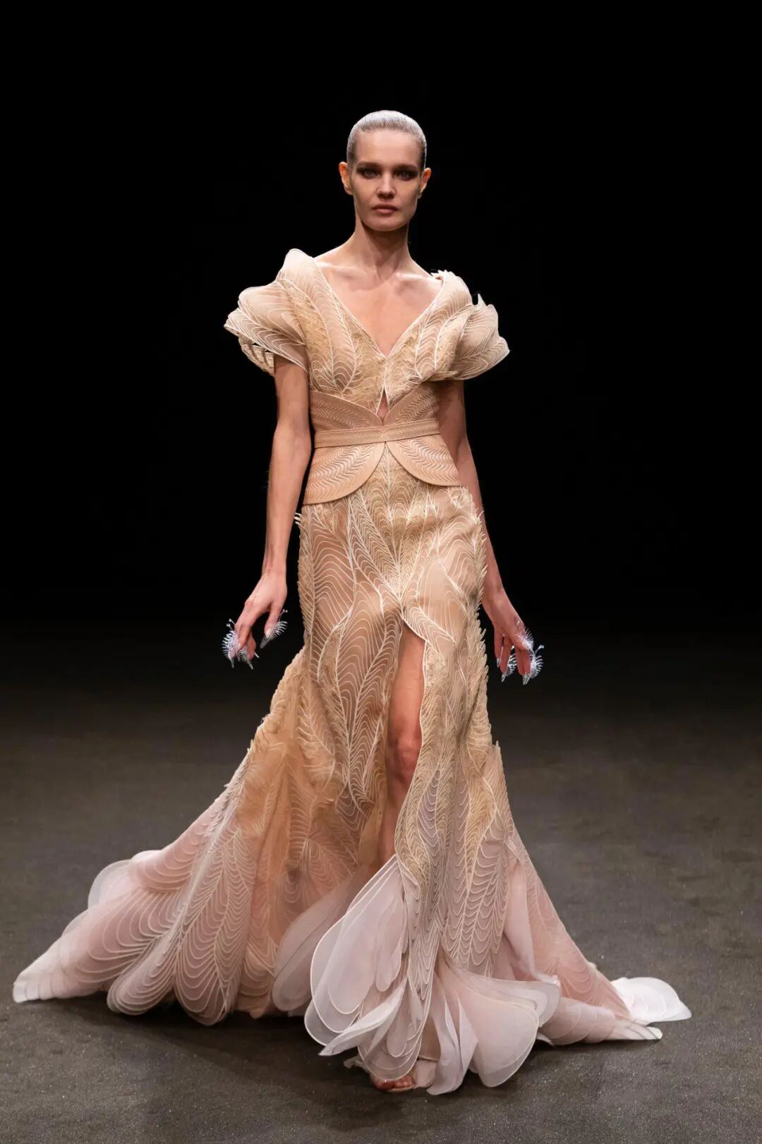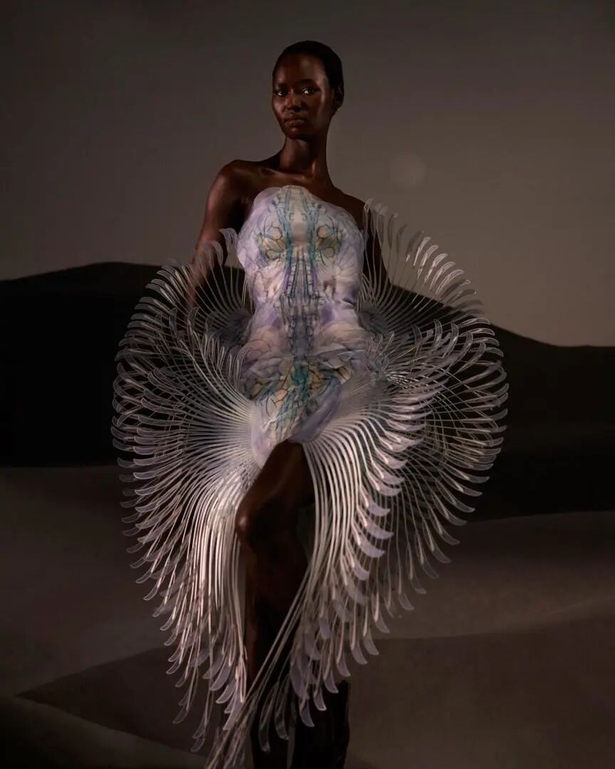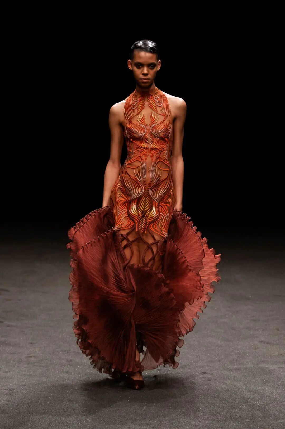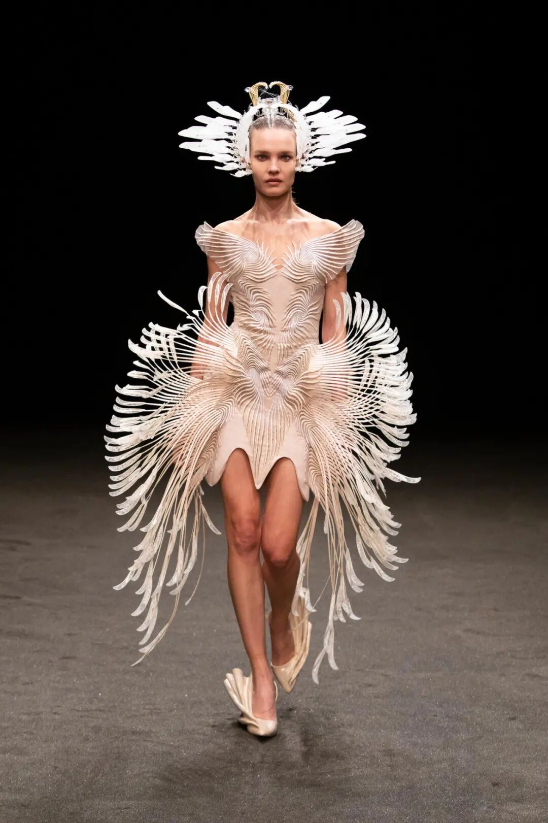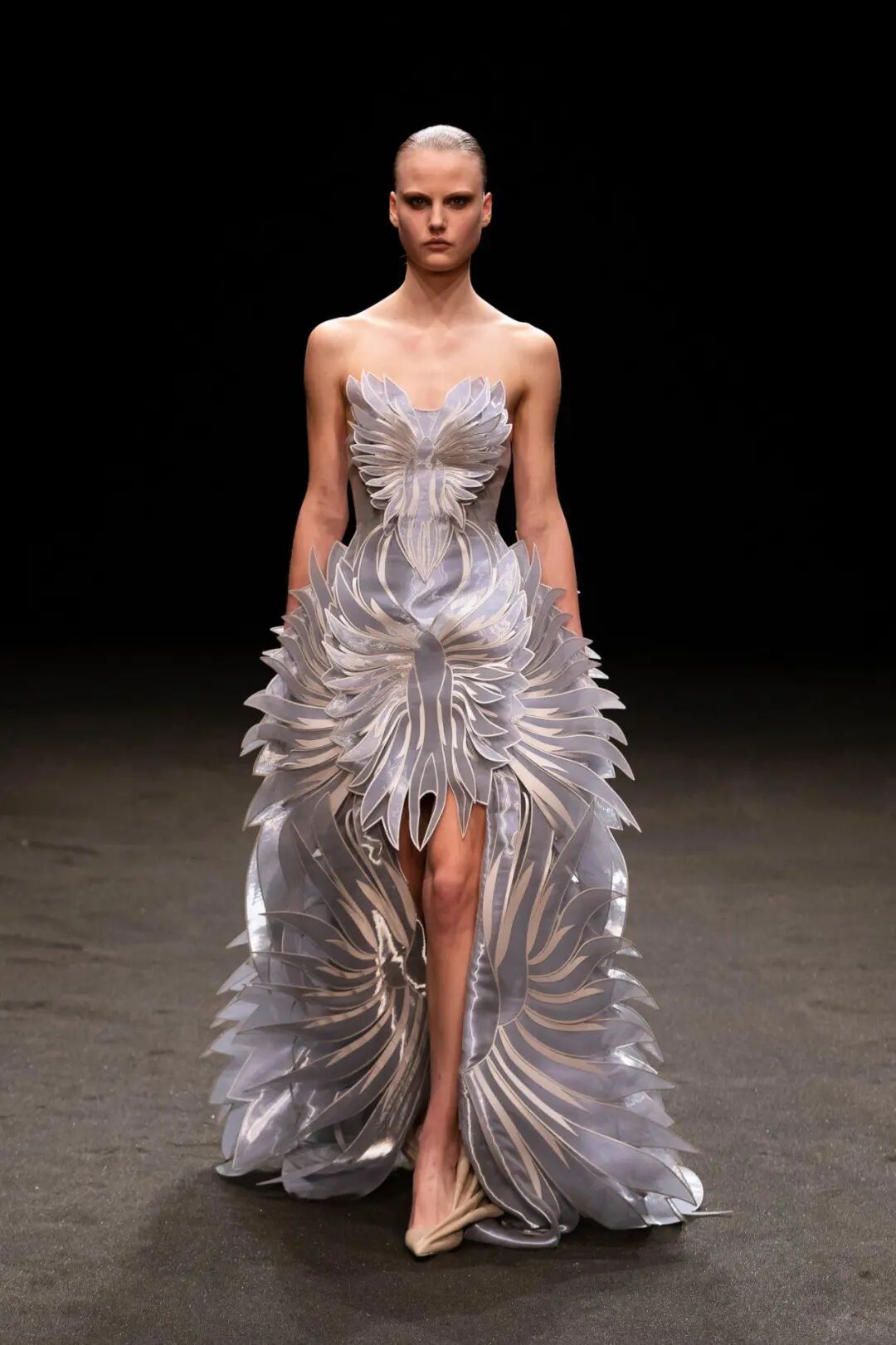 艾里斯·范·赫本崇尚自然之美,她的很多设计灵感也是来源于大自然,自她从业以来,一直致力于推动自然、建筑、时尚和科学之间的跨学科对话,她设计的服装总是让人意想不到,光是使用的材料就足以让人吃惊,不论是通过电磁编织塑造一件礼服裙,还是用3D手工铸造的透明皮革雕刻一件连衣裙,她的每一次操刀,都会诞生出一件十分抢眼的服装设计作品。