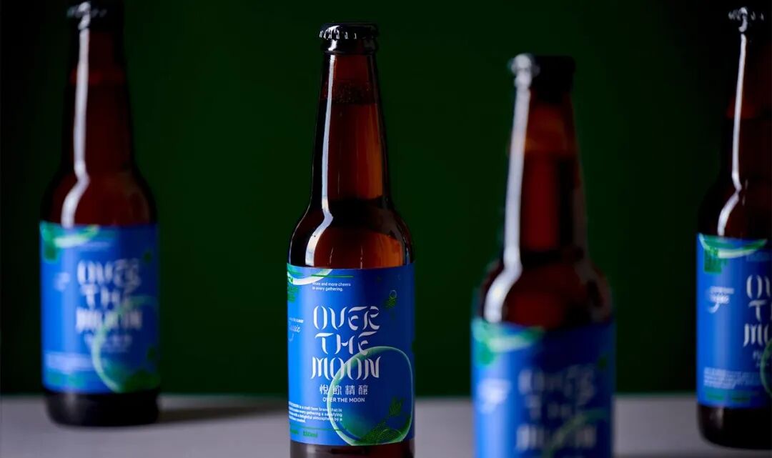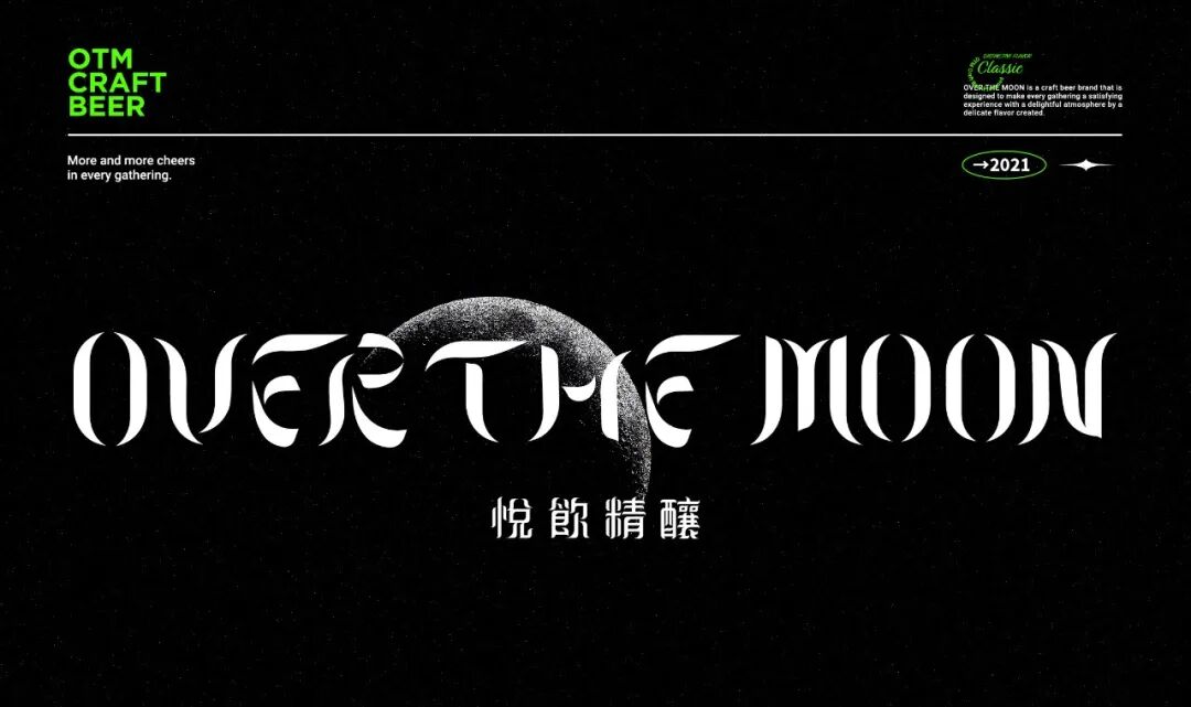 “Over the moon 悦饮精酿” 英文谚语中表达十分开心愉悦的心情,品牌传达出愉快微醺感受,品牌字体笔画设计取自月亮阴晴圆缺的变化,具有强烈的辨识度。