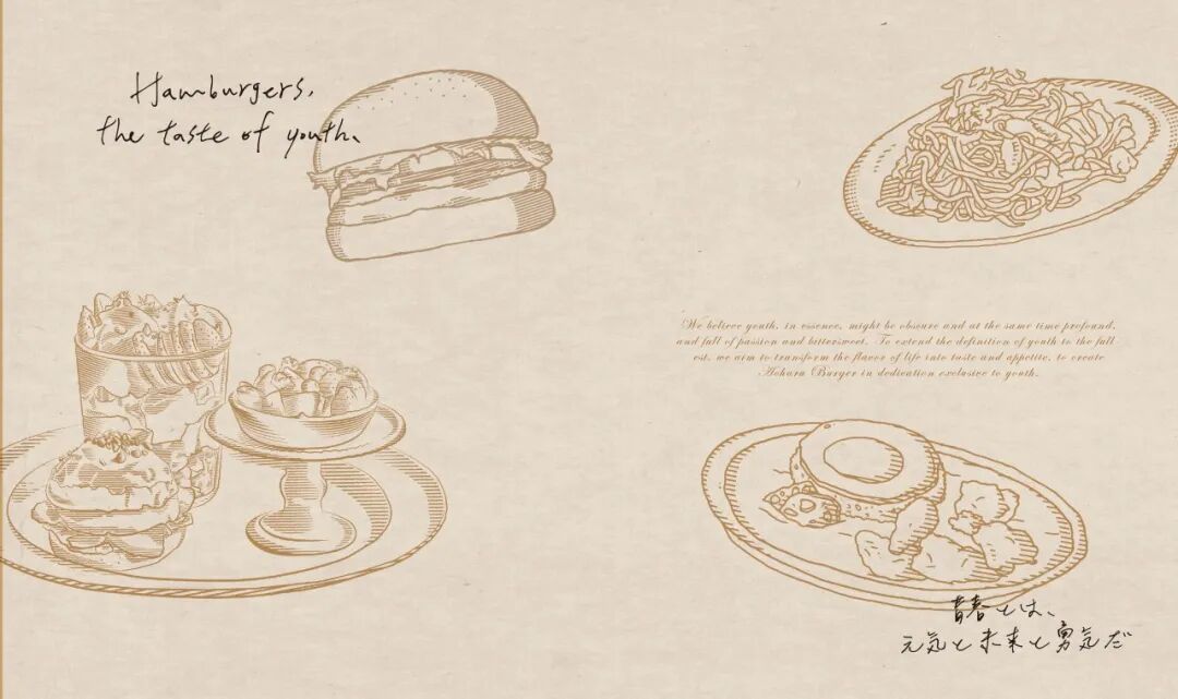 LOGO是双人共舞的符号,手上拿着汉堡与饮料,一点点小趣味青春洋溢的感觉,整体品牌富有层次的日本洋食文化风格。
