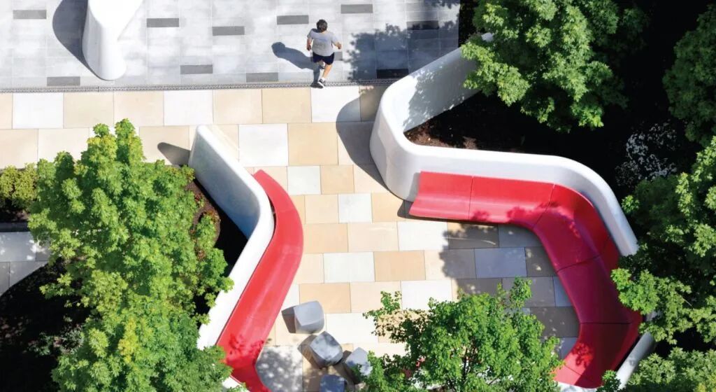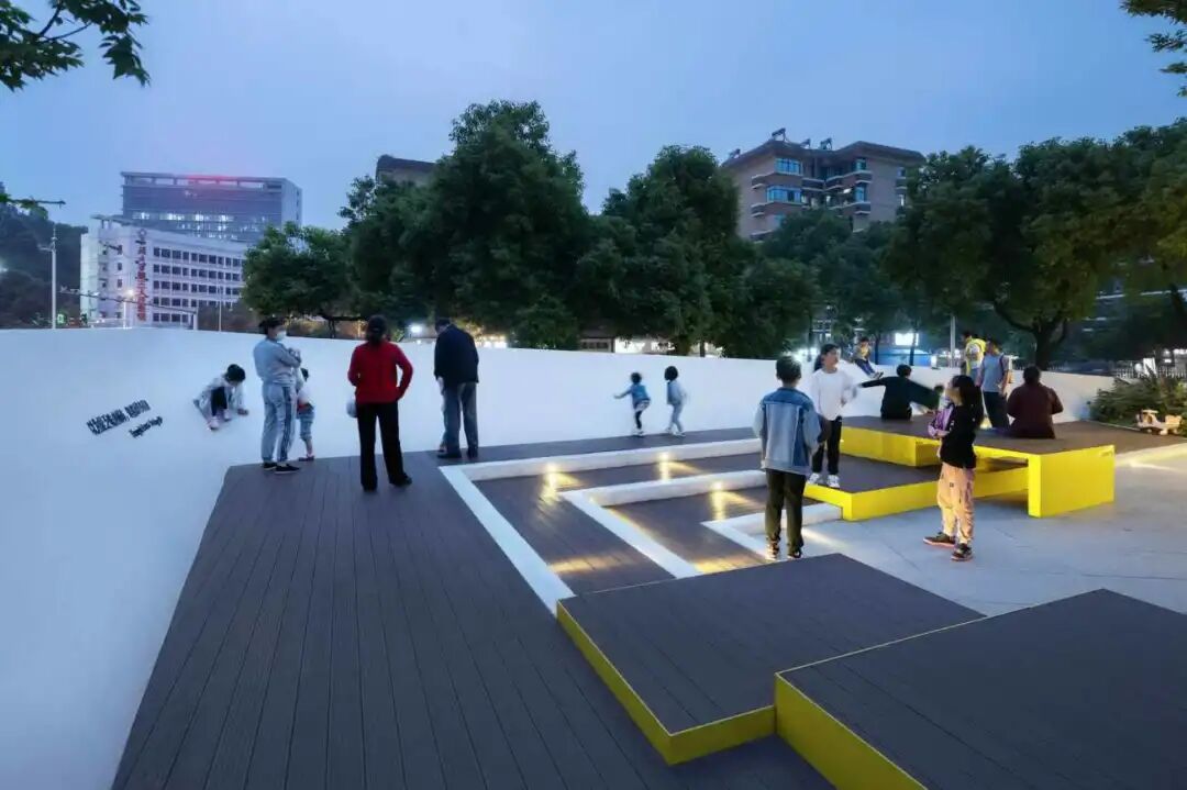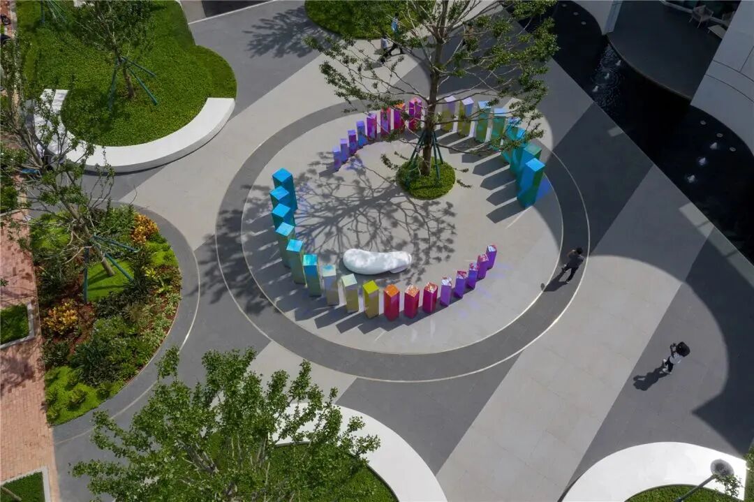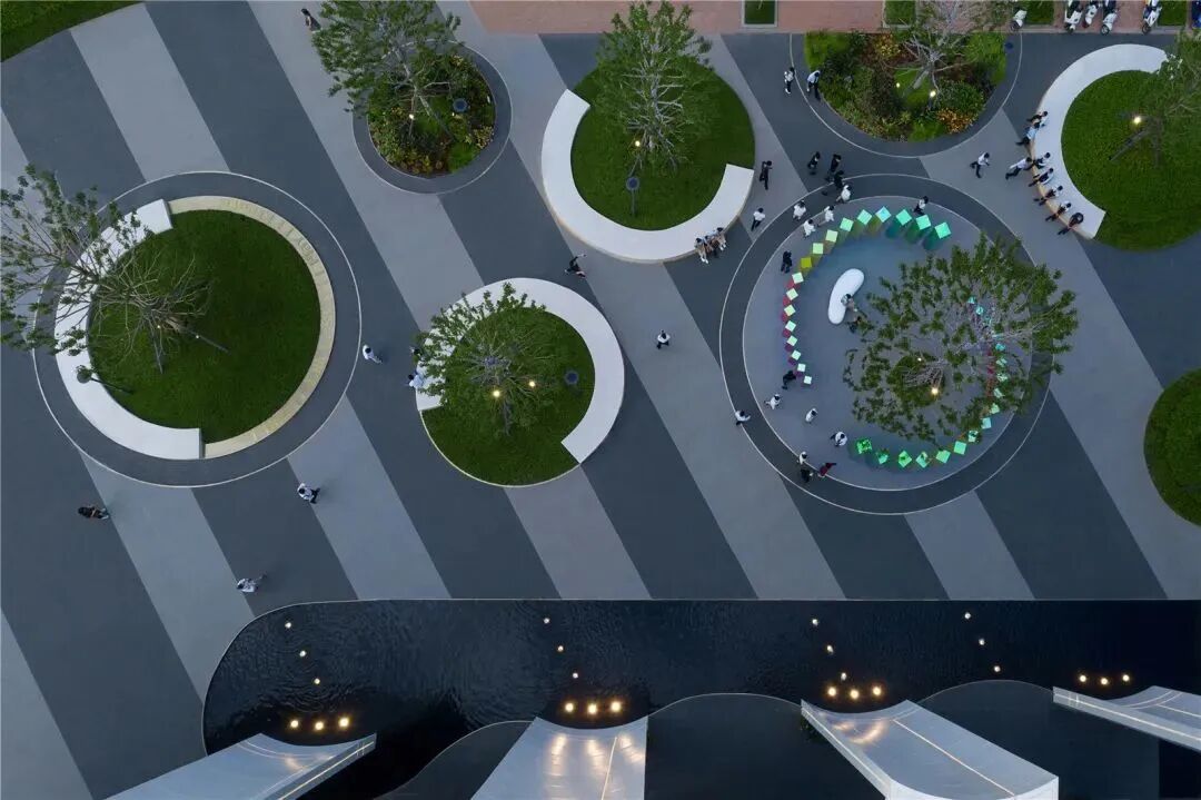设计者使用圆形将纵横交错的城市街道肌理萌化,人们在这里行走时不断的相遇相交,并重新定义了一条行走的路径,而边界的坐凳及装置,也能够使更多的人乐意前往,公众和路人的介入也将为广场带来计划之外的“即兴”事件,从而激发城市的活力。