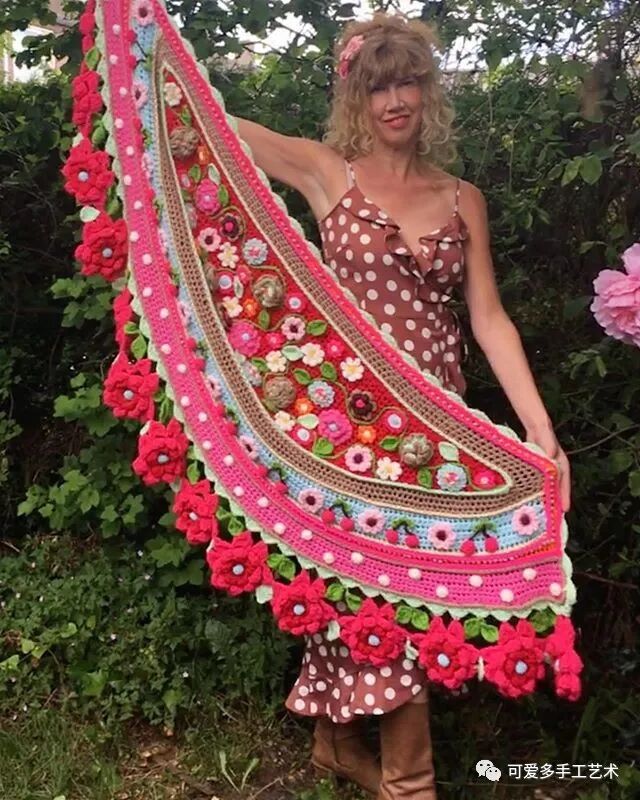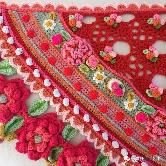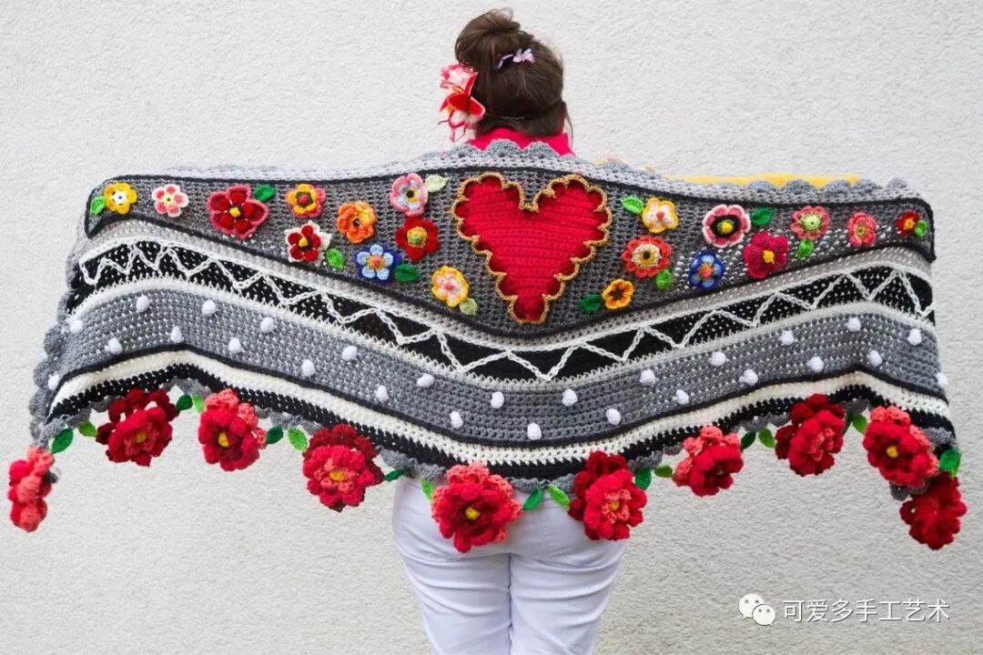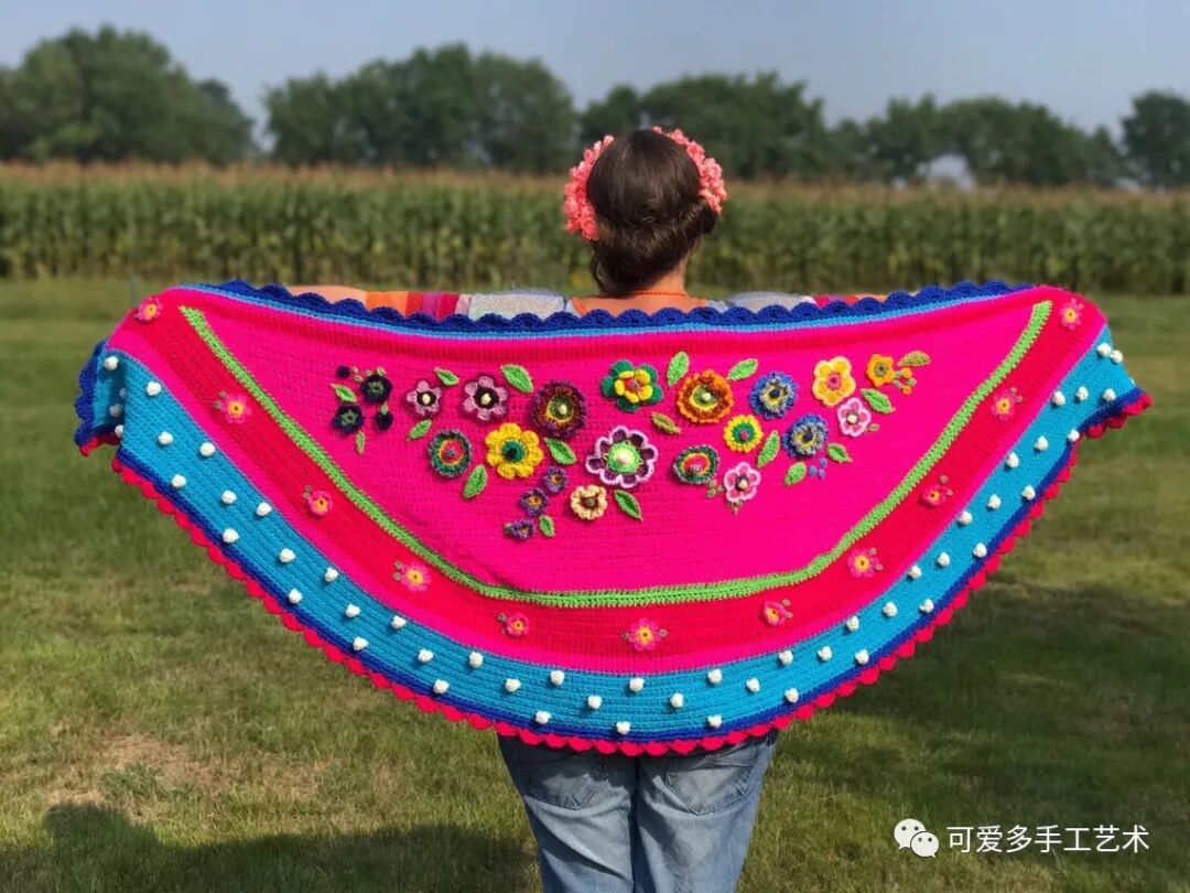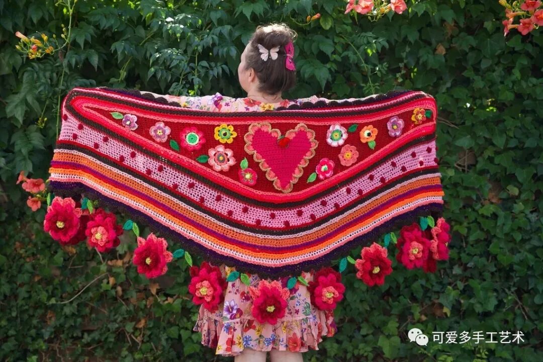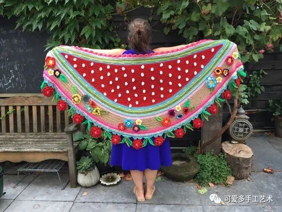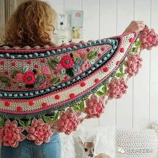 先起针钩出三角围巾的大小,之后按照自己喜欢的图案,换线钩几圈花样形成一条大披肩,最后把钩好的小花都在边缘钩连接进去即可。喜欢叶子可以再钩上一圈做点缀。