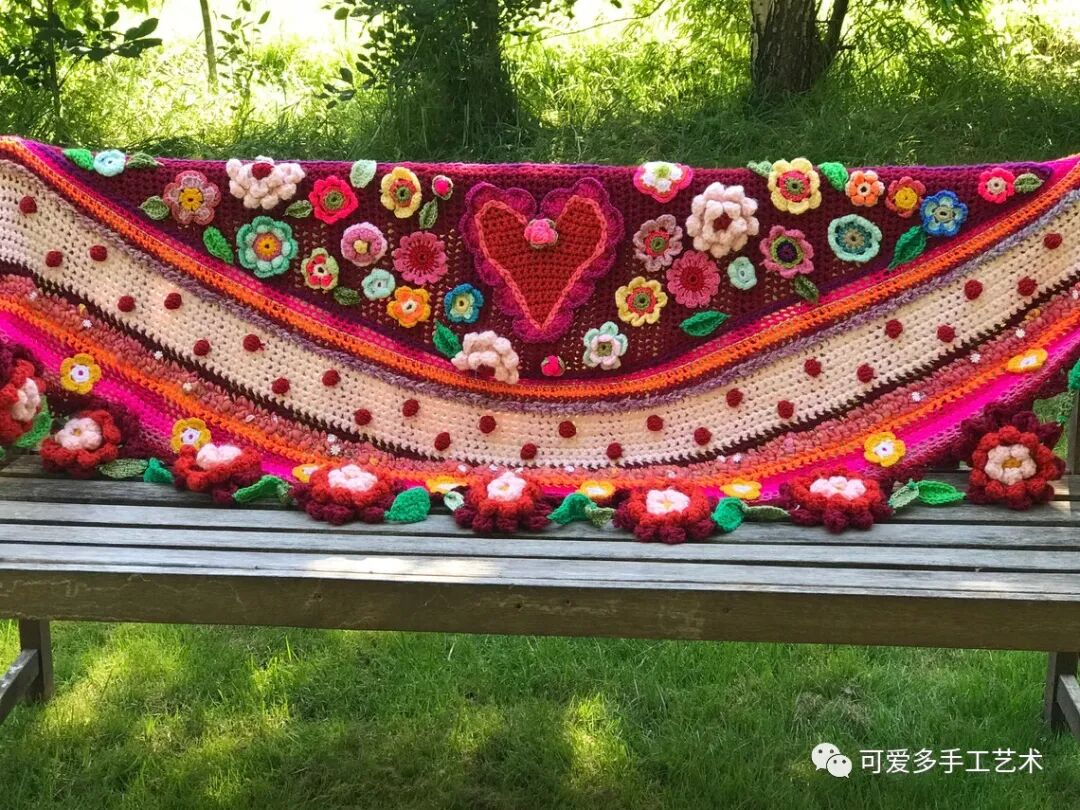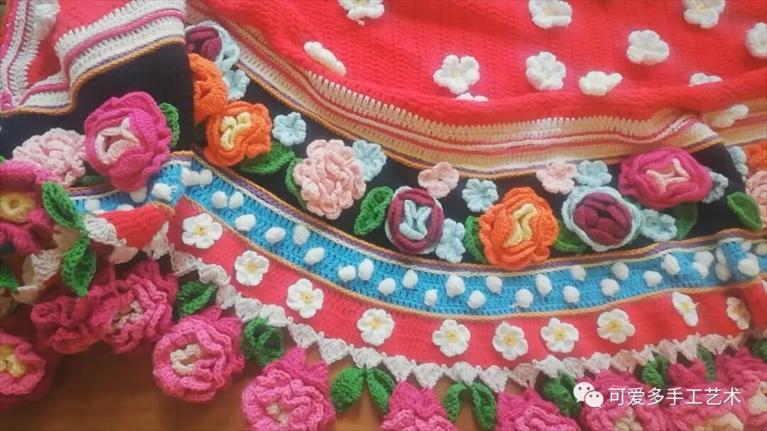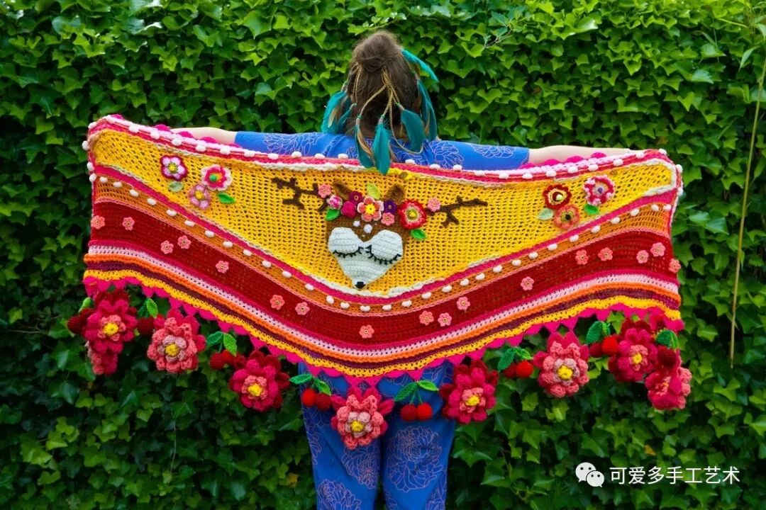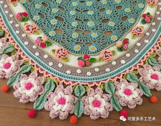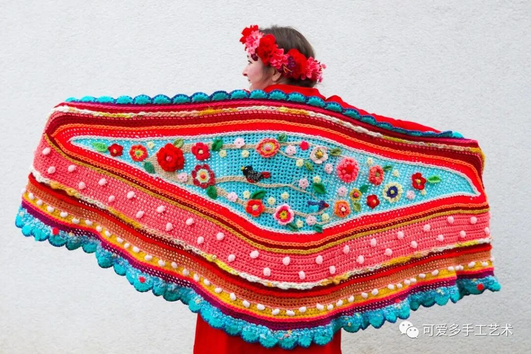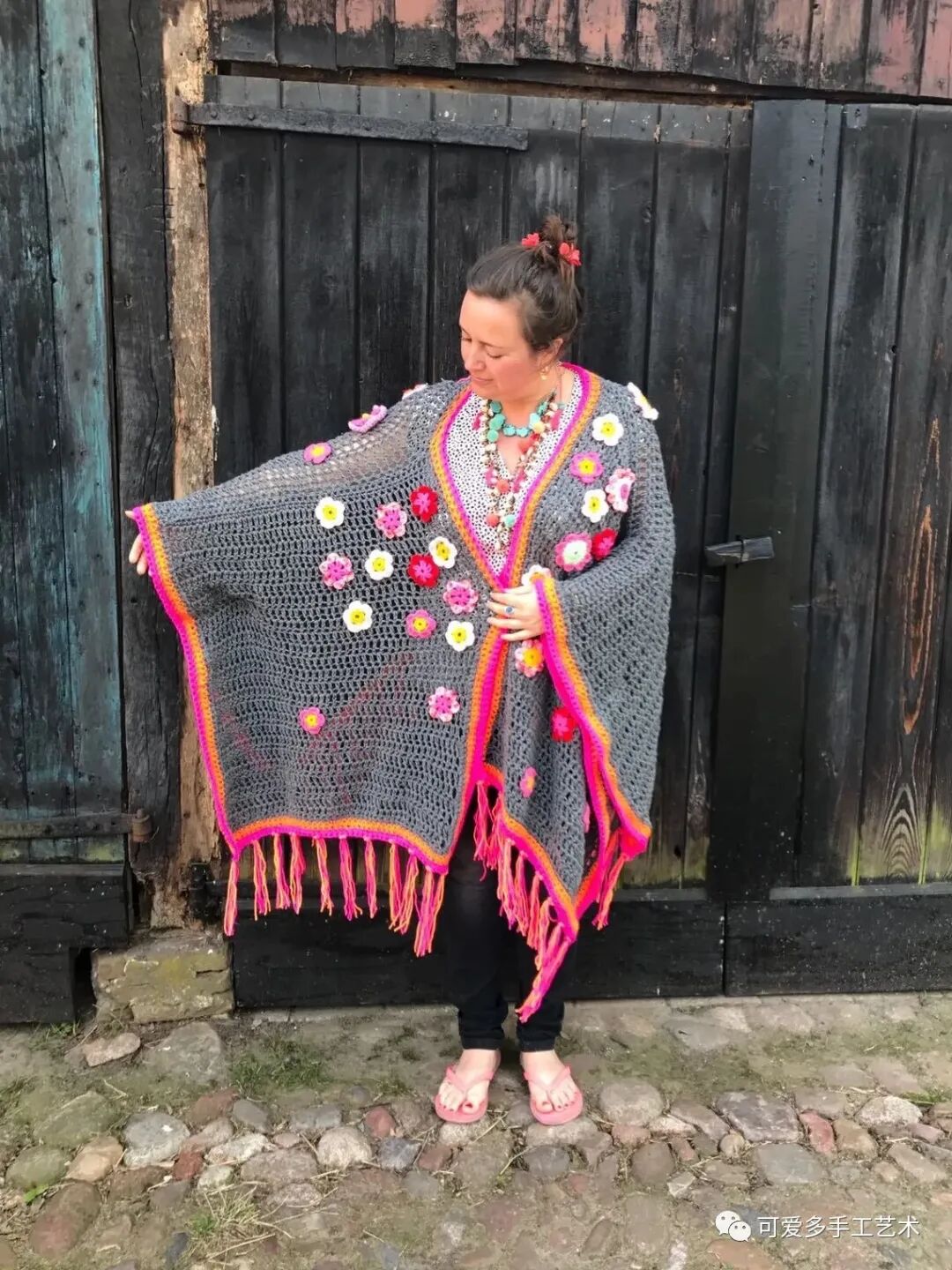 先起针钩出三角围巾的大小,之后按照自己喜欢的图案,换线钩几圈花样形成一条大披肩,最后把钩好的小花都在边缘钩连接进去即可。喜欢叶子可以再钩上一圈做点缀。