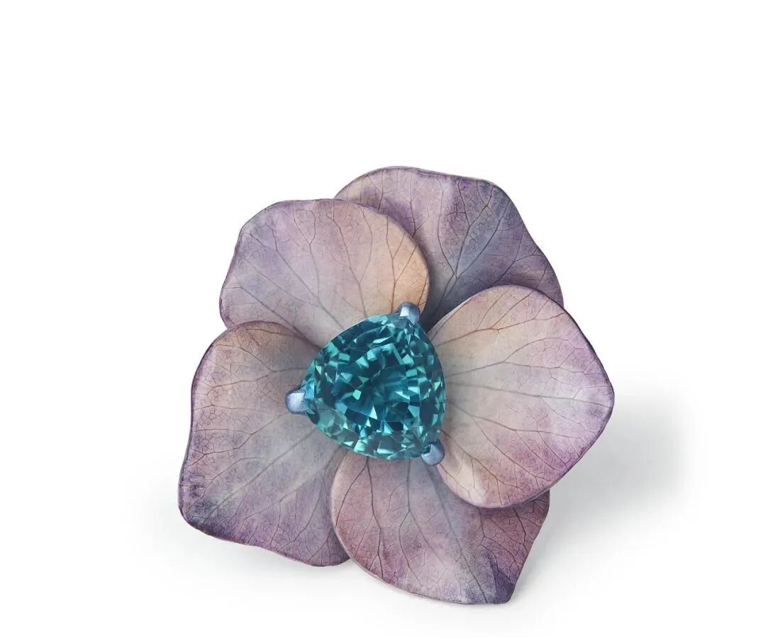 早在20世纪初的新艺术运动(Art Nouveau)时期,宝诗龙就开始运用珐琅、金雕工艺来创作绣球花主题的珠宝。戒面上的花瓣由风干、密封处理的鲜花制作,保留了天然纹路与天鹅绒般的光泽。