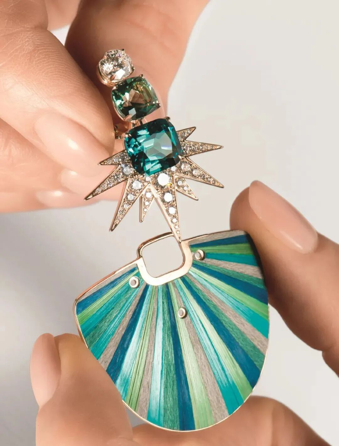 这个系列一共有三件作品,其中胸针上镶嵌一颗25.01ct莫桑比克绿碧玺,花瓣下方掩映着一片绿色钛金属叶片,与主石清澈的蓝绿色调相呼应。