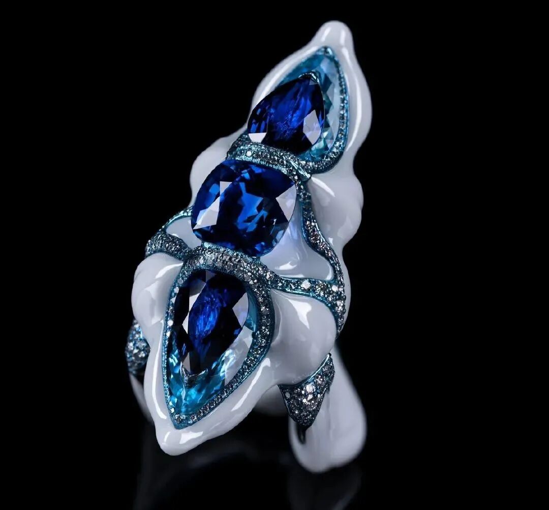 首件以世英陶瓷创作而成的作品《宇宙新生》,材质为蓝宝石、海蓝宝石、钻石、世英陶瓷、钛金属。这件2019年成为大英博物馆永久馆藏。