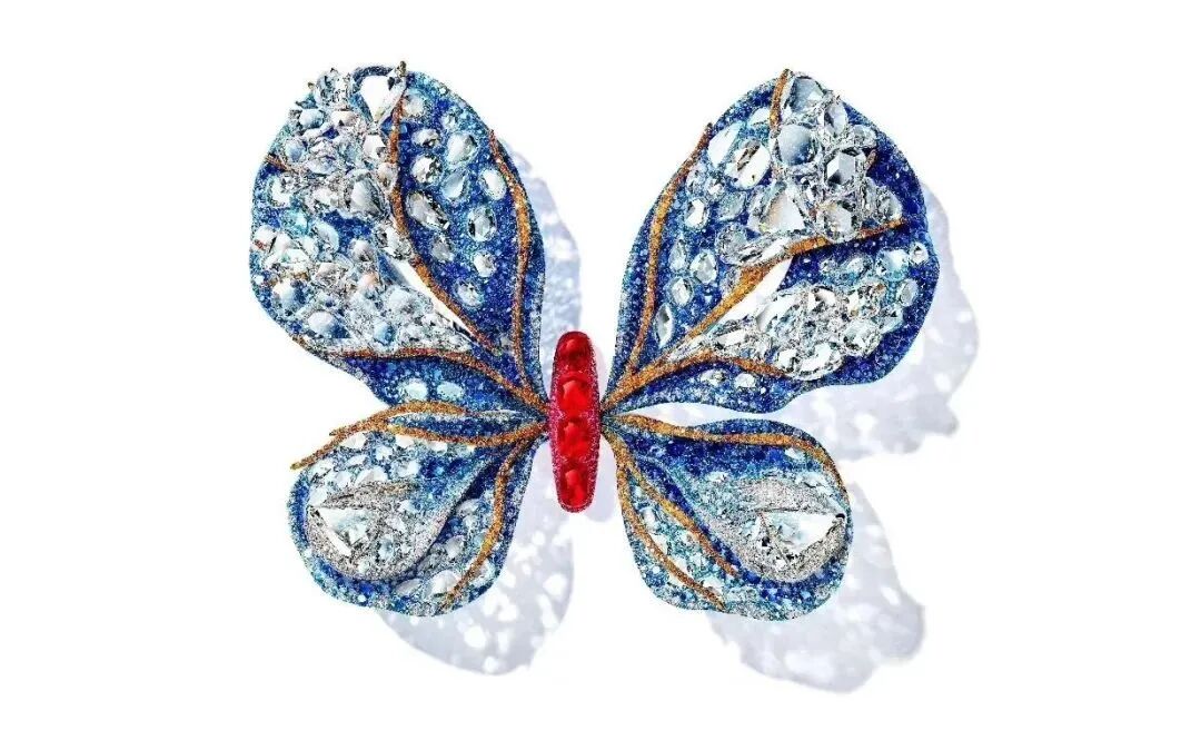 著名的极光蝴蝶胸针,将7种不同色阶、2000多颗蓝宝石,采用密钉镶嵌方式,渐层分布于钛金属曲面底座;再从6000多颗钻石中精选出多达10种、共163颗不同形状的玫瑰式切割钻石,采用群体镶座和立体焊接的方式,固定于钛金属上。