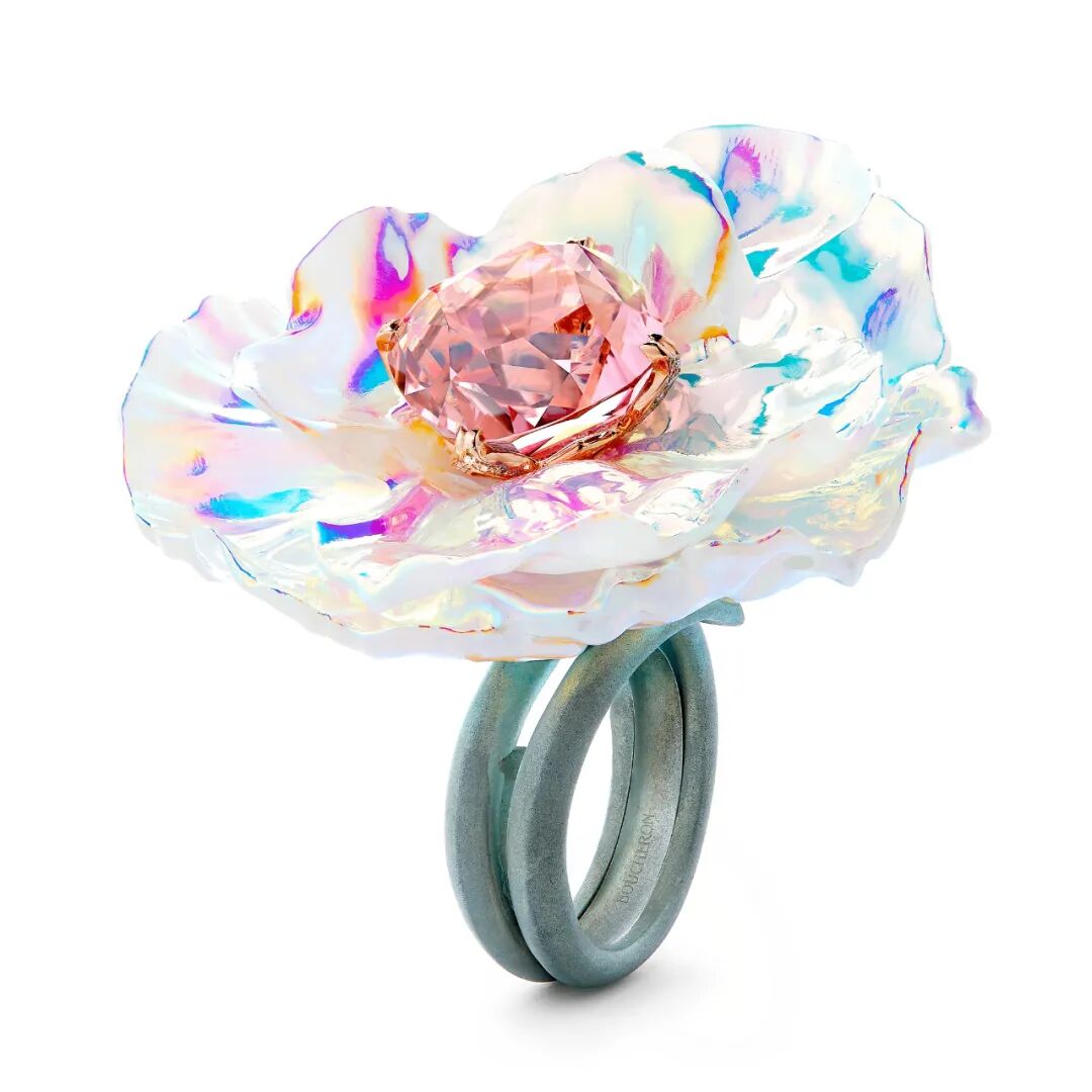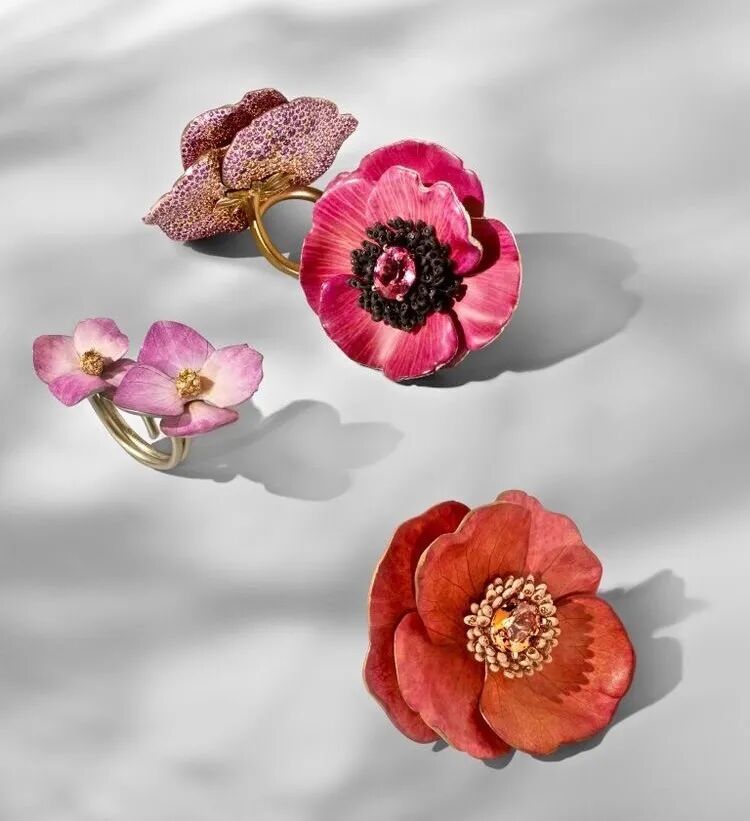 这些花朵经过精心挑选和处理,完美地保留其鲜花的质地、轻盈感和天鹅绒般的光泽,且不易破碎。华贵璀璨的珠宝与大自然的娇艳结合,一朵朵怒放鲜花变成可以永恒开放的珠宝,再次打破了传统高级珠宝的界限。