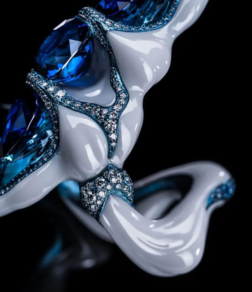 上图这款蔚蓝曙光羽饰胸针,以极轻的钛金属打造羽干,甄选包括珍稀皇家蓝蓝宝石在内的14颗梨型切割蓝宝石,共计2055颗颜色层次分明的宝石共同塑造,绽放羽毛多变的色泽和丰富的光芒。