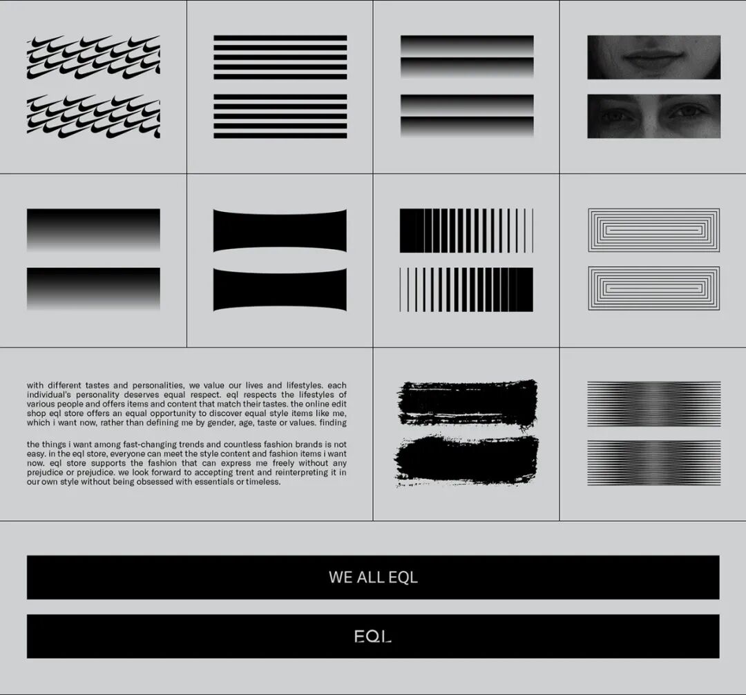 所以,EQL的品牌标志来自一个平等的标志,就像“等于我”的品牌理念一样。几何、等分灵活排列的布局体现了品牌理念。