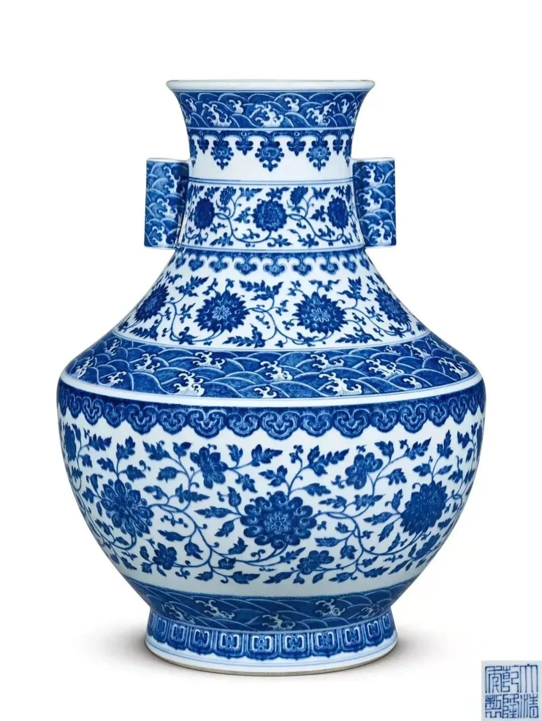 本品缠枝自然弯曲,延展流畅,形成开窗八面,其内分别装饰莲托八吉祥图案,其排序从法轮开始,从左到右依次是轮、螺、幢、伞、花、鱼、瓶、结,这是明初永乐年间形成的规律。底属典型的“大明宣德年制”青花双圈六字三行楷书款,朴拙苍健,古意盎然。罐子青花发色特具时代风格,虽经修补,然而完整无缺肉,是极为难得一件的明初宣德官窑作品,曾是香港著名收藏家赵从衍的旧藏。