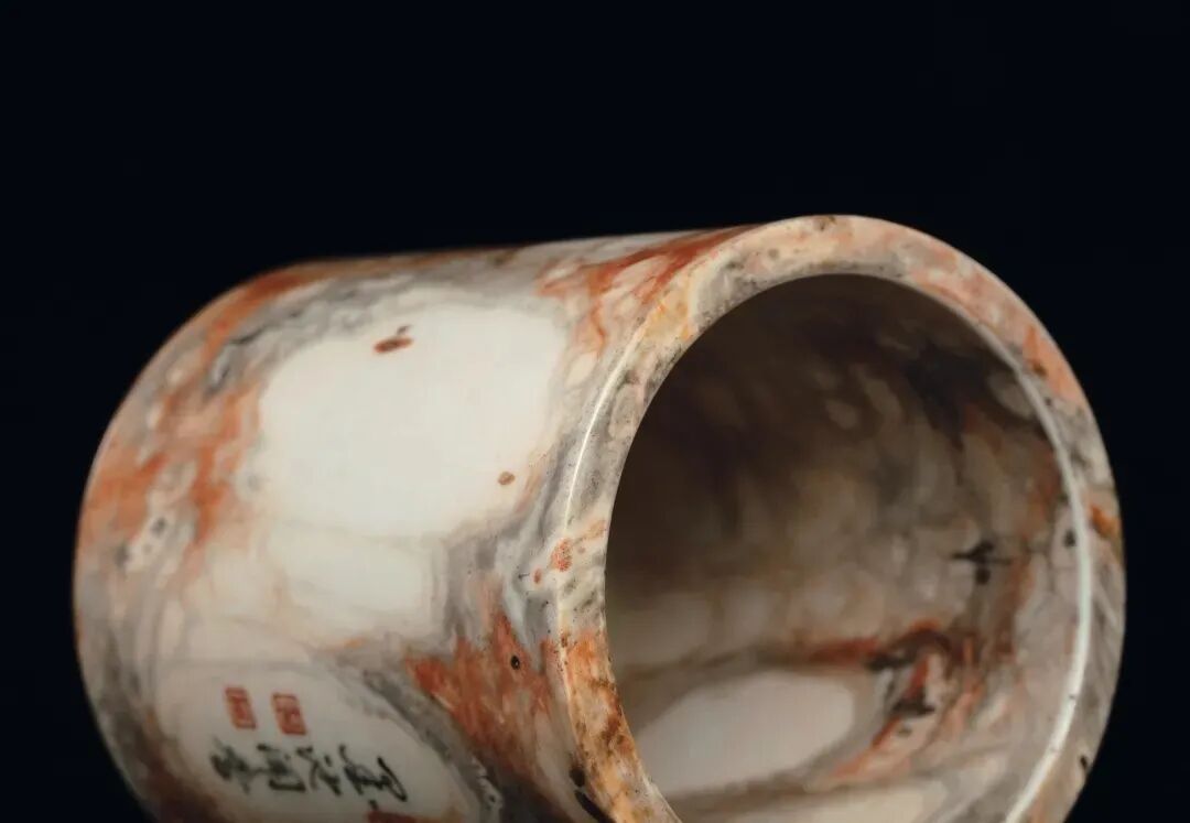清乾隆 唐英制仿石纹釉墨彩「墨池闻香」笔筒 高9.3cm