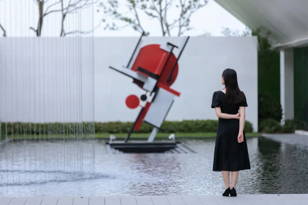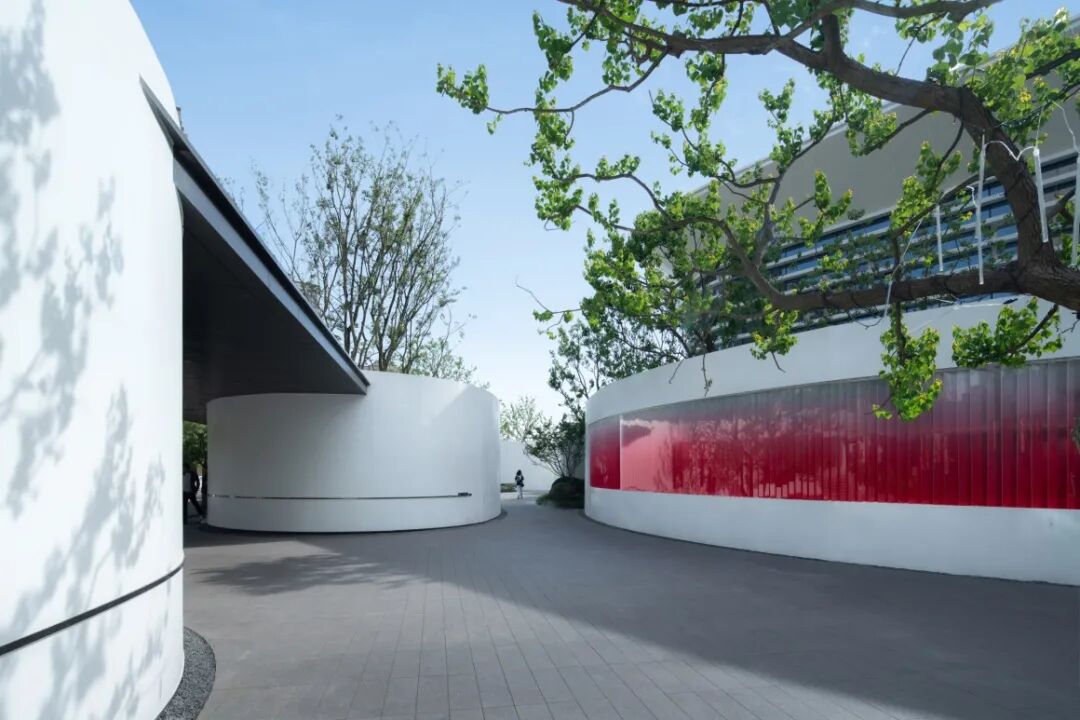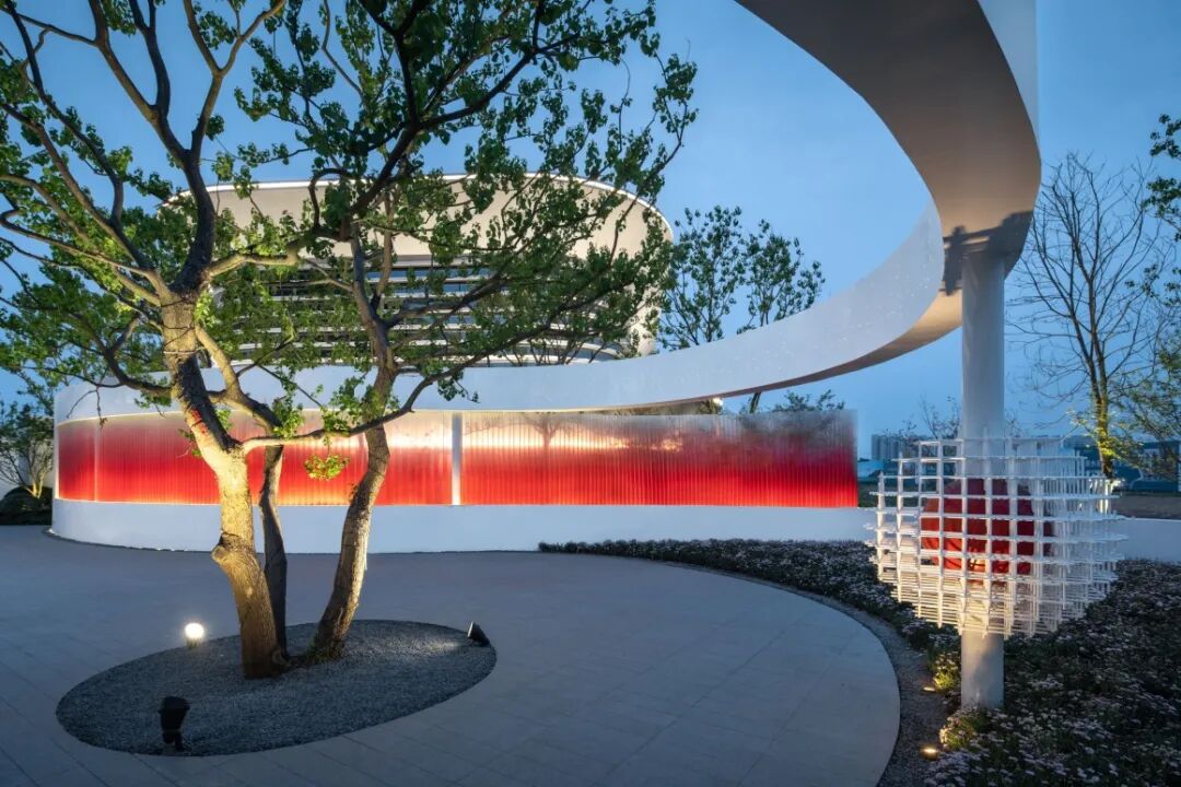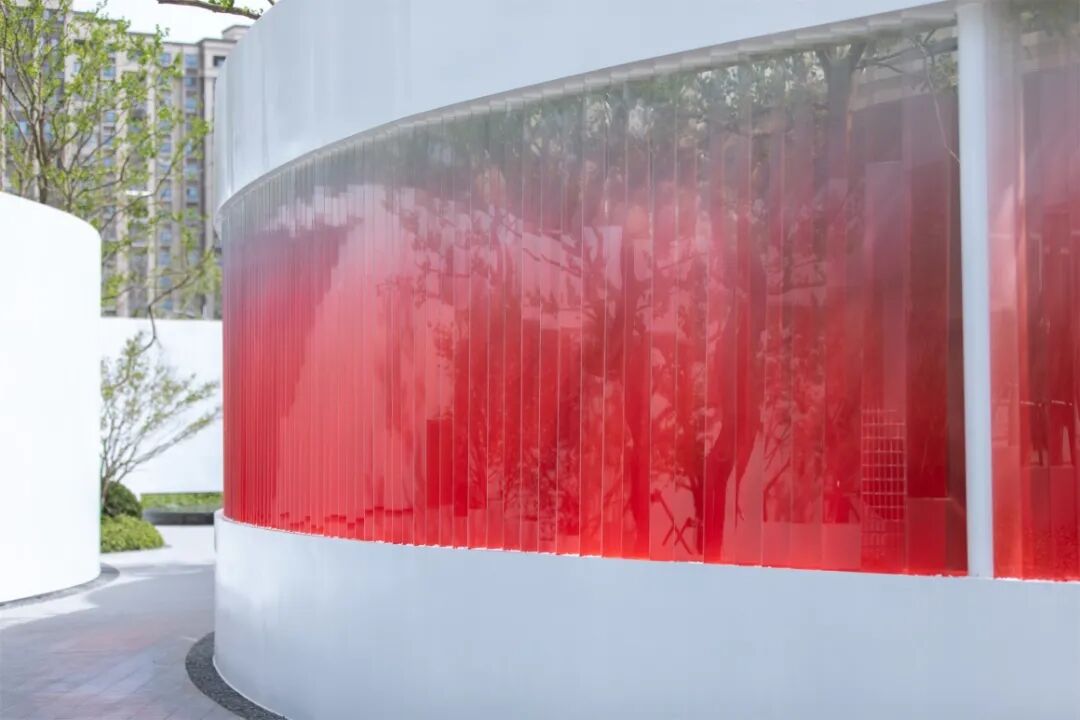 亮眼的红色构架连接着市政界面与下沉庭院,犹如停留在山谷之中的凤凰,由主入口延绵至售楼部。穿越在空中廊道,移步易景,流连忘返,在色彩的激情碰撞中,俯瞰整个场地,感受线条与生俱来的行云流水。