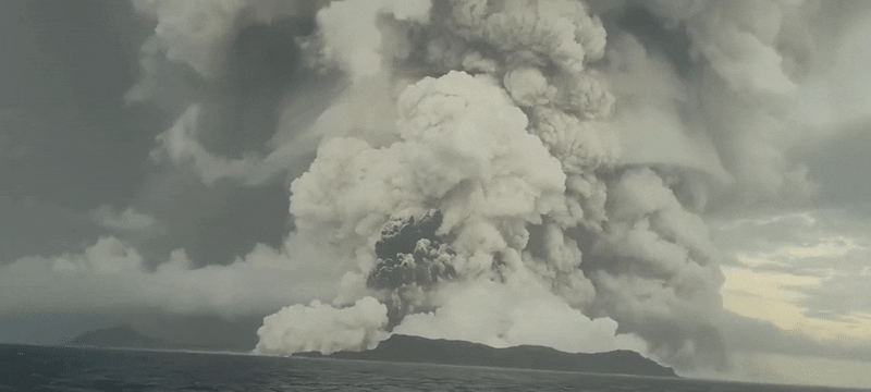 喷发的气柱达到了惊人的20千米,巨大的爆炸声震慑到了800千米之外的斐济,并在斐济沿海造成了长达半小时的震动。诺贝尔物理学奖得主布莱恩·施密特教授将此次爆发形容为“1000颗广岛原子弹”。根据1月18日卫星图像显示,位于火山口上的洪阿帕伊岛已被炸飞,消失在茫茫大海中。