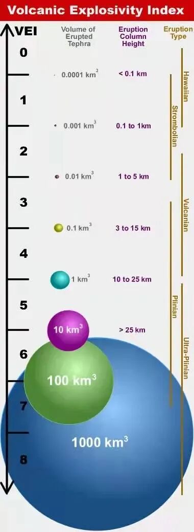 喷出物质的总体积是目前最广泛使用的VEI级数判定标准。小于1万立方米的,属于VEI 0级;超过1万,属于VEI 1级;达到100万立方米,属于VEI2级,也就是1级的100倍;之后,喷出物总体积每提升10倍,VEI级数升高一级。